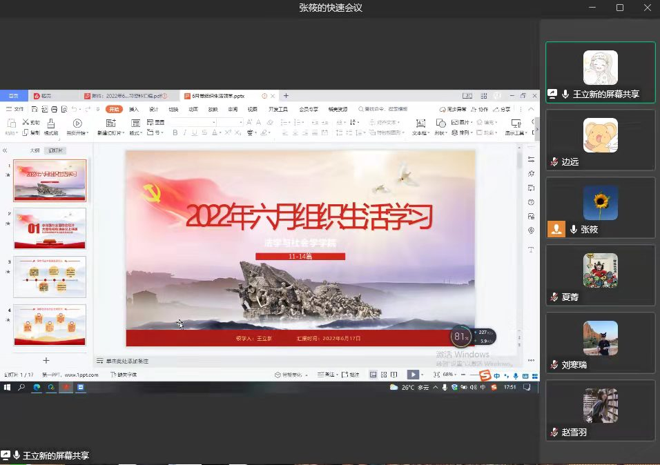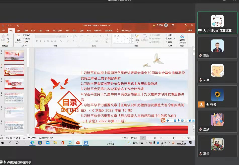 2022年6月17日17:30,437437必赢国际研究生一支部于线上召开了六月组织生活会,本次会议由何祖润同志主持,会议的主要内容为六月组织生活会学习。