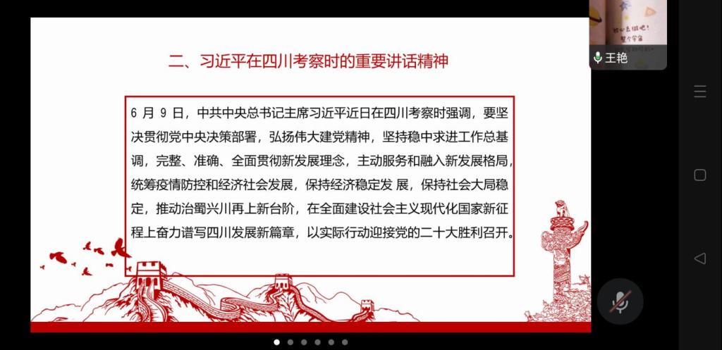 会议第二部分,由裴璐同志带领党员学习了“全球发展高层对话会主席声明(全文)”“习近平在湖北武汉考察时的重要讲话精神”“习近平在香港视察时的重要讲话精神”“习近平在庆祝香港回归祖国 25 周年大会暨香港特别行政区第六届政府就职典礼上的讲话(全文)”“习近平总书记重要文章《坚定不移走中国人权发展道路》(《求是》2022 年第 12 期)”“习近平总书记重要文章《更好把握和运用党的百年奋斗历史经验》(《求是》2022 年第 13 期)”等相关内容。着重分享了习近平同志在文章中所强调的相关内容:推进马克思主义中国化时代化,正确把握社会主要矛盾和中心任务,重视战略策略问题 ,永葆党的马克思主义政党本色 ,推进党史学习教育常态化长效化。