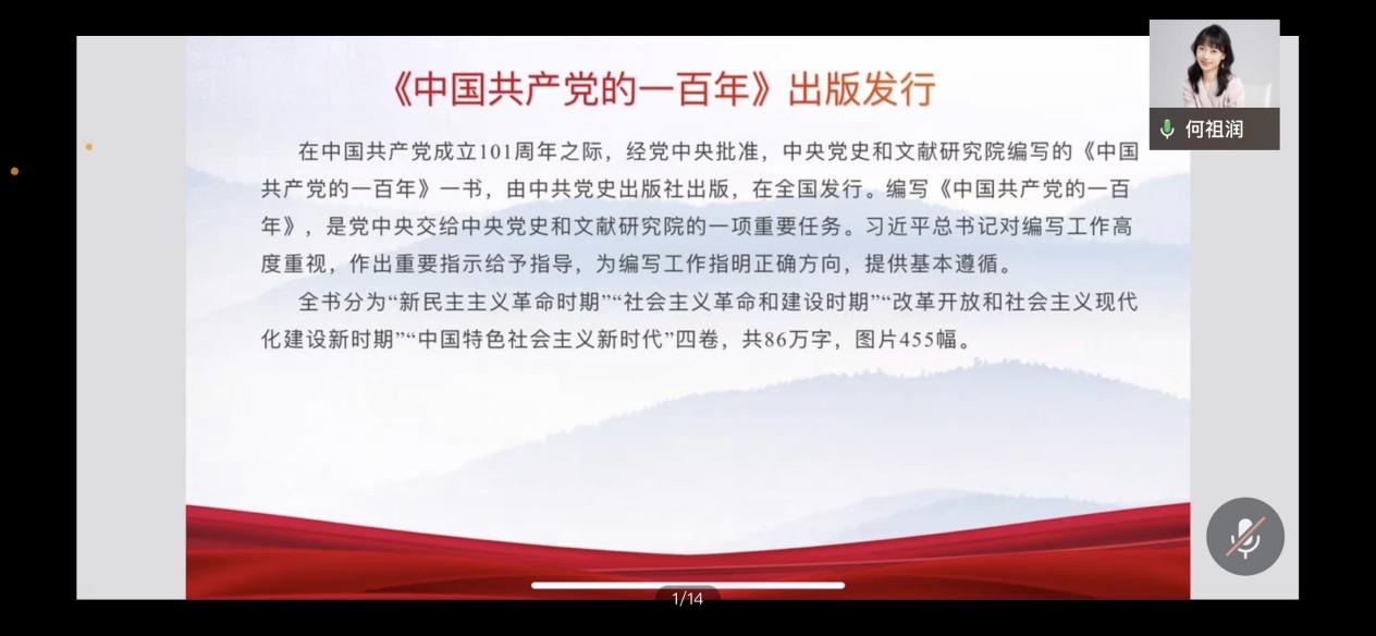 会议最后,何祖润同志为支部党员讲党课,介绍了书目《中国共产党的一百年》。《中国共产党的一百年》是一本坚持以习近平新时代中国特色社会主义思想为指导,深入贯彻落实习近平总书记关于中国共产党历史的重要论述以及关于党史和文献工作的重要讲话和指示批示精神,坚持唯物史观和正确党史观,坚持解放思想、实事求是,坚持党性原则和科学精神相统一,集政治性、思想性、权威性、学术性、可读性于一体,是全国迄今为止公开出版的读物中,全面系统反映中国共产党历史时间跨度最长、内容最系统最完整的一部党史正史著作,何祖润同志推荐各位同志精读这本书,以便能够全面、系统地了解中国共产党的历史。(供稿:刘雨青)