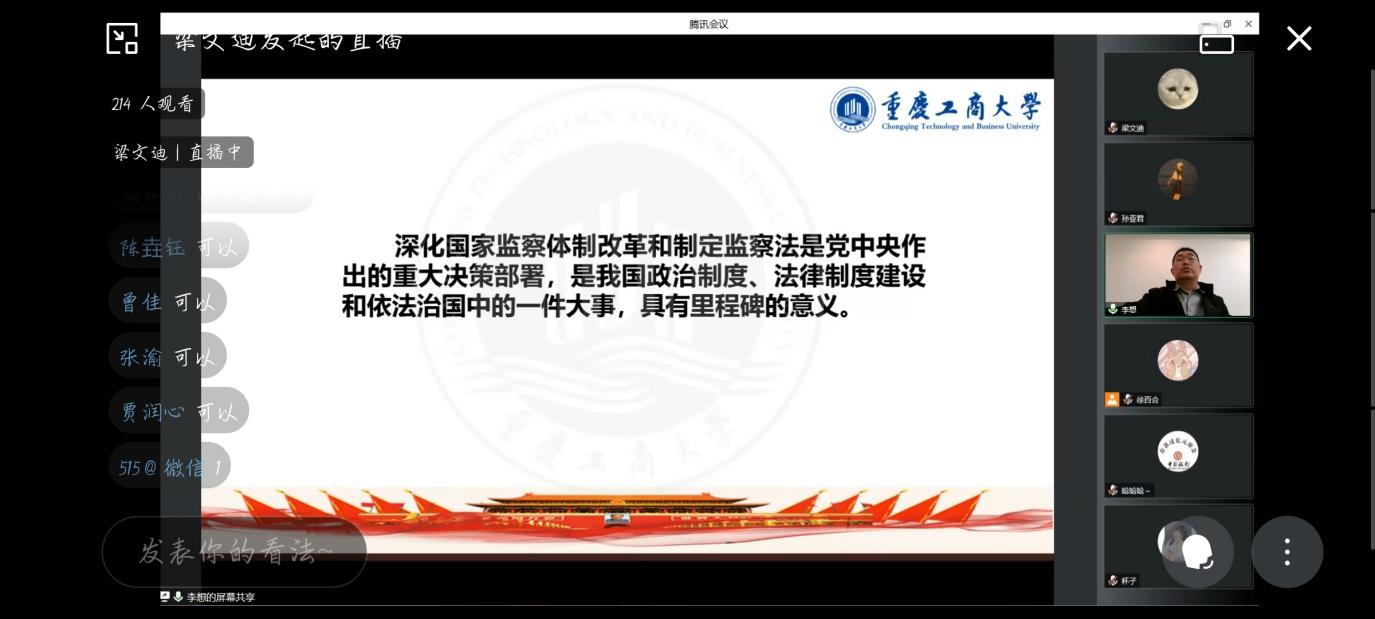 之后,在律动青年法学社、大学生廉洁文化研究会联合举办的“公生明,廉生威”廉洁文化线上宣讲活动中,重庆廉洁研究中心研究员、437437必赢国际法学系教师李鹏飞担任主讲人,线上参与活动人数超过240人。李鹏飞以《中华人民共和国监察法》为切入点进行讲解,从真实案例、实际工作经验出发,引导同学们充分认识制定《监察法》的意义,进一步感受廉洁文化的熏陶,深化廉洁文化对在校大学生的影响。