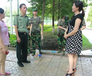 “峥峥铁骨,蕙质兰心,扬我法学,自强不息”刚到训练场地就被学员们晒不退的热情所感染。整洁的军装,整齐的步伐,气宇轩昂的口号,教导员李自维和法学院副院长刘勇老师不由自主地为他们鼓起掌来。教导员李自维就军训相关工作作了安排和指导,特别强调要坚持生命第一的原则,全力保证学员们的安全。在保证安全的基础上,希望军训学员严格要求自己,做到“特别能吃苦,特别能战斗,特别能奉献”,在短短13天的军训中提升自己。随后,还耐心地对跟训的几位同学根据他们自身的特长安排了相关工作,希望他们也能在军训中尽自己力所能及之力发光发热。慰问学员结束后,两位老师还和教官们亲切地攀谈起来,亲切的家乡话也让教官们倍感温馨,并把早已准备好的清凉饮料递到了教官的手中。