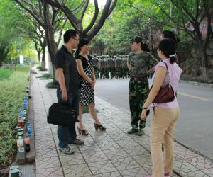 7月3日下午四点,二团二营(法学院)教导员李自维、法学院副院长刘勇老师在辅导员林细妹老师、陈丹妮老师的陪同下一同前往学海南路看望二团二营正在训练的全体学员。