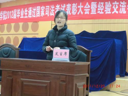 2011年的国家司法考试终于揭晓谜底,法学院2008级学生喜获佳绩,有19人顺利通过考试。12月20日,法学院在慧智楼模拟法庭成功召开2012届毕业生通过国家司法考试表彰大会暨经验交流会。法学院党总支书记杨和义、院长华鹰、08级辅导员林细妹、以及通过2011年司法考试的全体同学和09级同学出席了此次大会。本次大会由党总支副书记李莉莎主持。