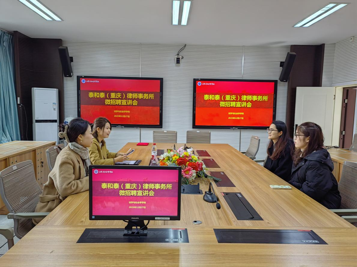 为更好的搭建毕业生求职平台,推动学院就业帮扶工作走深走实,12月27日,437437必赢国际抓住考研结束的关键期,联合泰和泰(重庆)律师事务所在南岸校区90429会议室举办微招聘宣讲会。会议由学团办主任何祖润主持,律所合伙人施青红到场招聘。