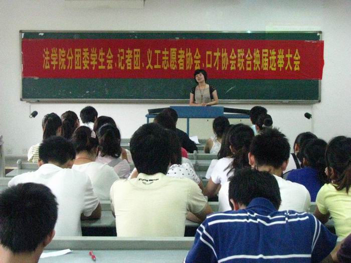 6月23日,法学院分团委学生会、记者团、义工志愿者协会以及口才协会于慧智楼90421教室联合举办了换届选举大会。法学院分团委书记林细妹老师、主席团成员和各个部门成员,以及学生代表参加了本次换届选举活动。