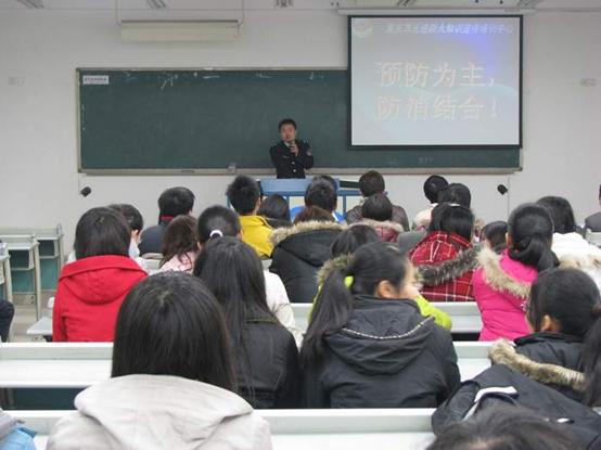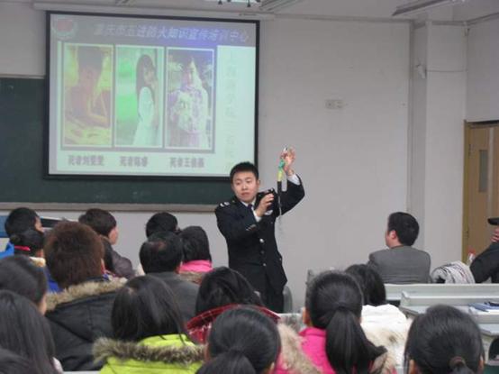 首先,杨教官向大家展示了“上海胶州湾学生公寓火灾”、“重庆豪华学生公寓火灾”以及“成都某高校宿舍火灾”等高校学生公寓遭遇严重火灾险情的图片。随后,杨教官分别从“火灾类型”、“火灾中错误的逃生方式”、“正确的自救方法”以及“防火设备的正确使用”四个方面进行了系统的阐述。同时,告诫大家在面临不可预防的火灾时,要冷静思考和准确判断,切忌大呼小叫,甚至选择跳楼及其类似的错误逃生方法,而应及时用湿毛巾或衣服等可以浸透的布料捂住口鼻,俯身前行来实现自救;而对于可预防的火灾而言,则应随时备好防火设备,在火灾初期及时遏制其发展。杨教官现场演示了灭火器、防烟面具以及安全绳的正确使用方法,也让同学们参与了模拟实验,以便大家真正掌握操作要领,从容应对火灾险情。整个讲解中,杨果教官由表及里、从理论和实践的双重层面向老师和同学们讲解了火灾隐患存在的危险性、消防安全的重要性以及面对火灾的自救措施,让大家进一步认识到了自我防患的有效性。
