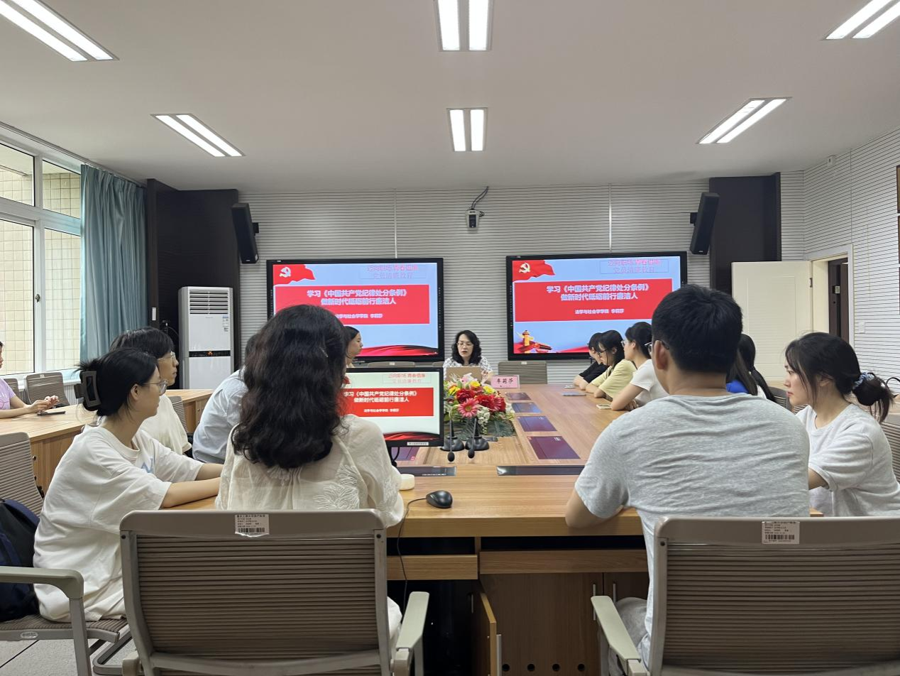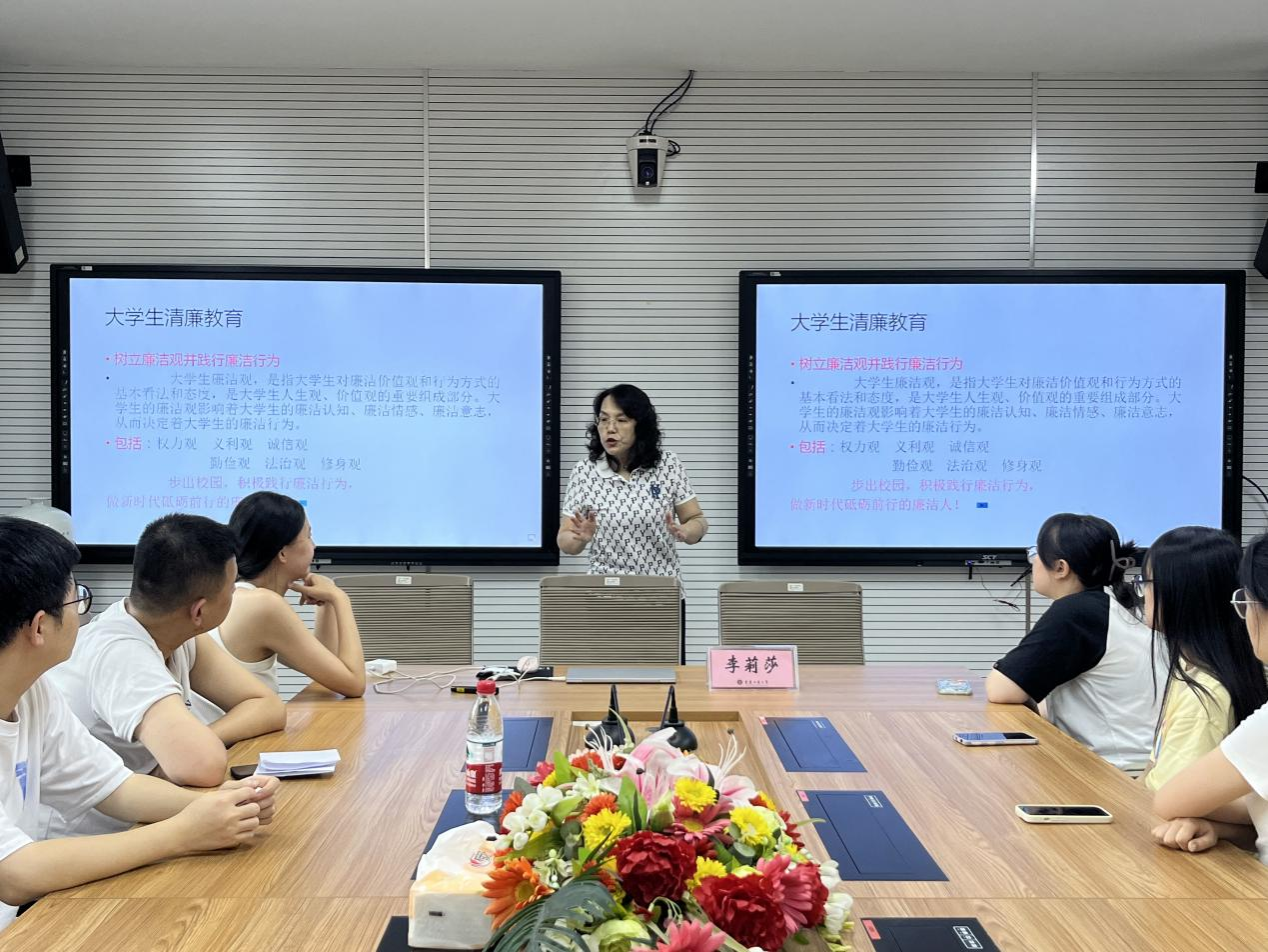 李莉莎从《中国共产党纪律处分条例》修订背景及要求、《中国共产党纪律处分条例》主要内容解读、大学生廉洁教育三个方面进行讲解。她从《条例》修订的历史脉络、各个章节的解读等方面入手,阐释了党纪处分、违纪责任、纪律处分的运用规则、案件审理流程等,用生动形象的案例为毕业生党员们开设了一堂警示课。最后,她深入浅出的从权力观、义利观、勤俭观、法治观、修身观等方面号召大家迈向职场之后积极践行廉洁行为,做新时代砥砺前行的廉洁人。