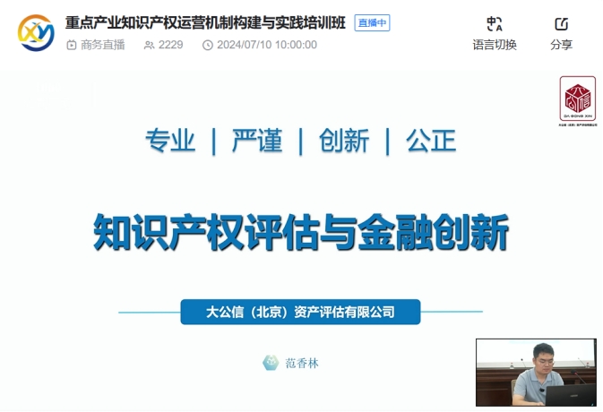网络直播:大公信(北京)资产评估有限公司西南运营中心评估评价部部长范香林就“知识产权评估与金融创新”进行了专题报告