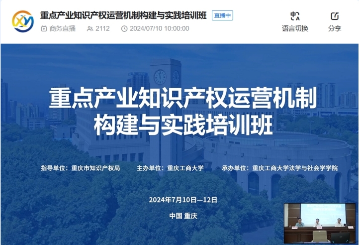 7月10日,由重庆市知识产权局主办,437437必赢国际承办的“重点产业知识产权运营机制构建与实践培训班”在437ccm必赢国际慧智楼90426会议室举行。培训采取线上线下相结合的方式,来自重庆市各区县科技局、中小企业公共服务中心、知识产权运营平台、高校及企业等80余个单位的120余名相关人员参加了线下培训,线上累计学习人数达到2000余人次。重庆市知识产权局处长谢从波在开班式上致辞。开班仪式由437437必赢国际院长刘勇主持。