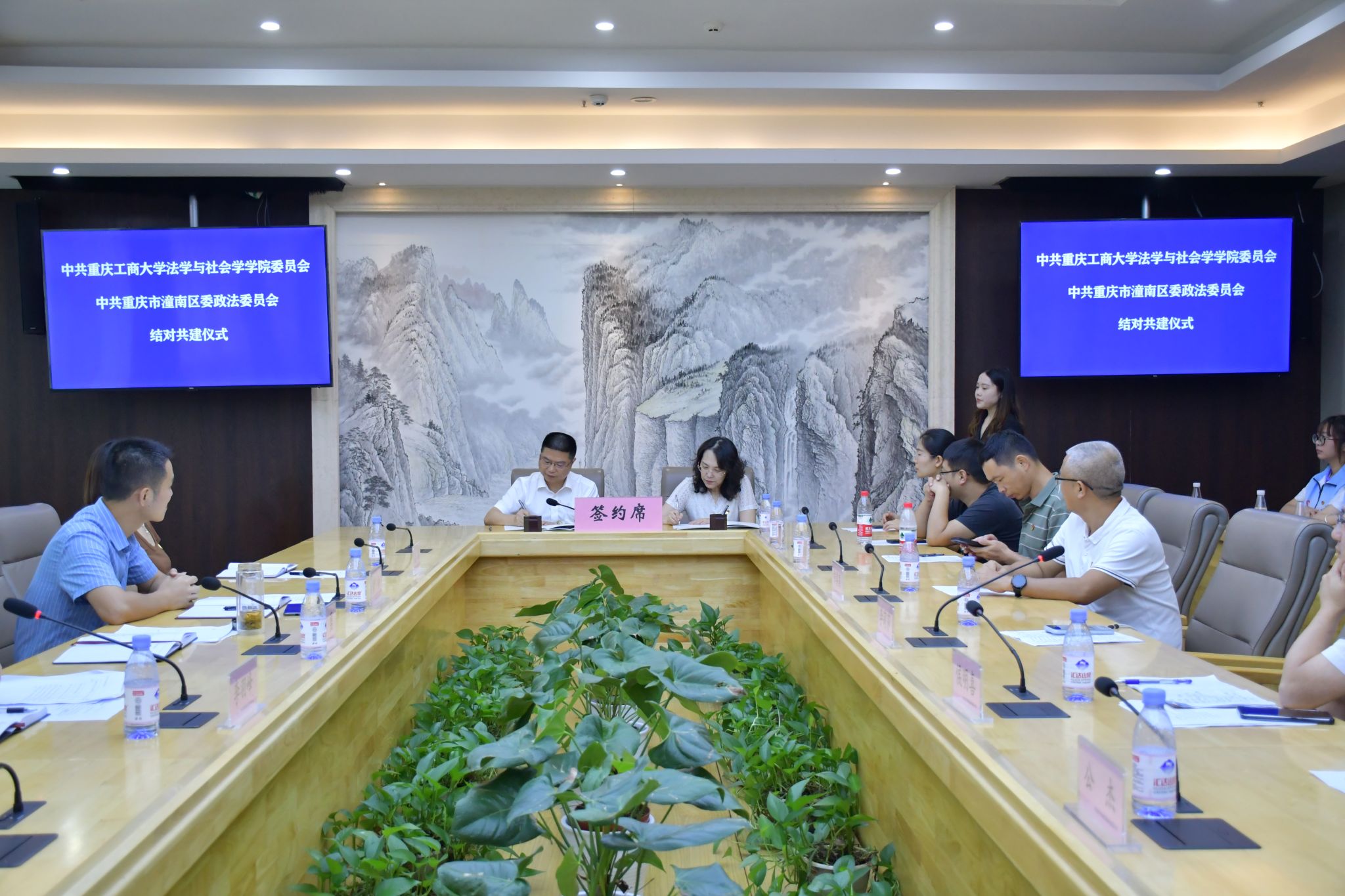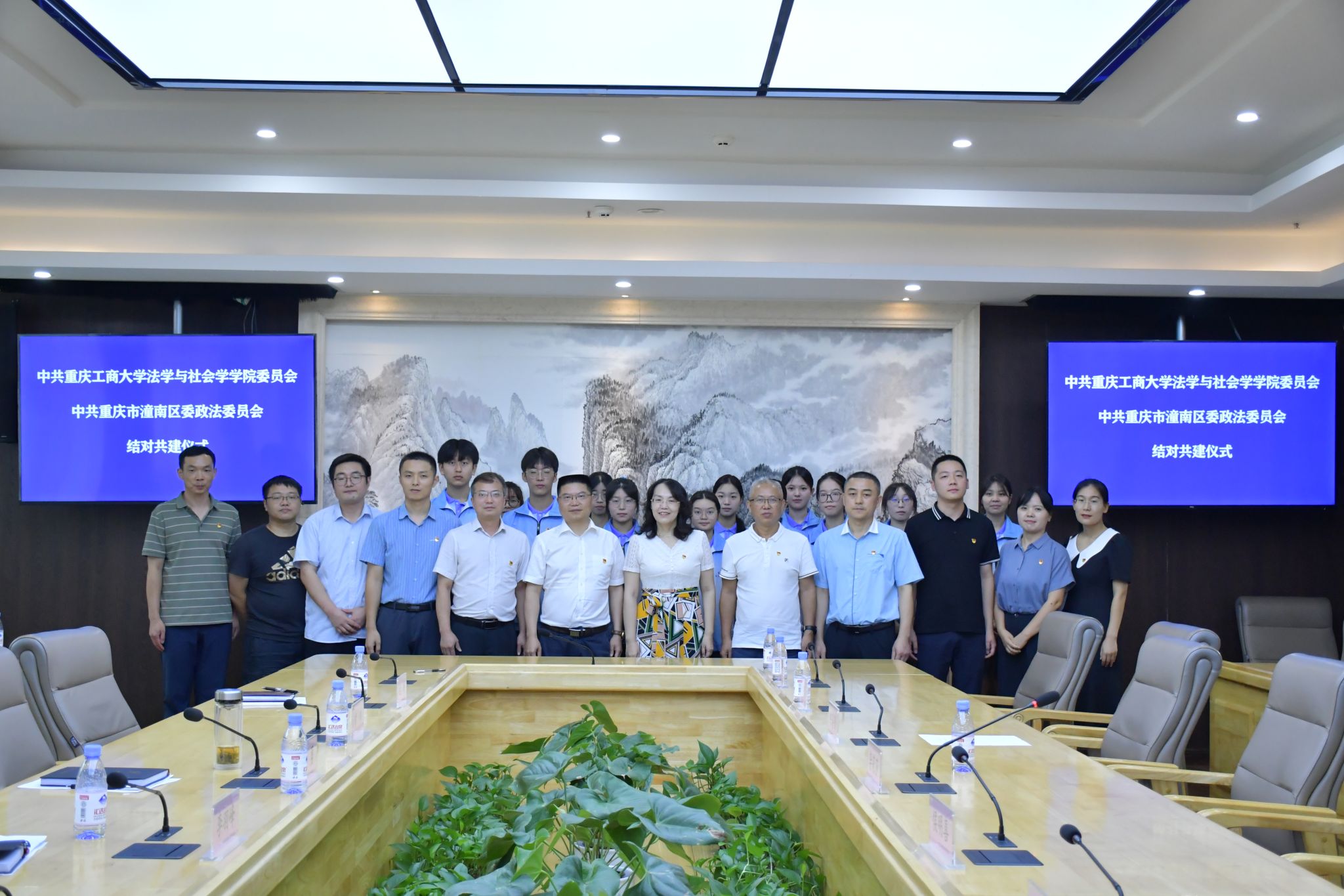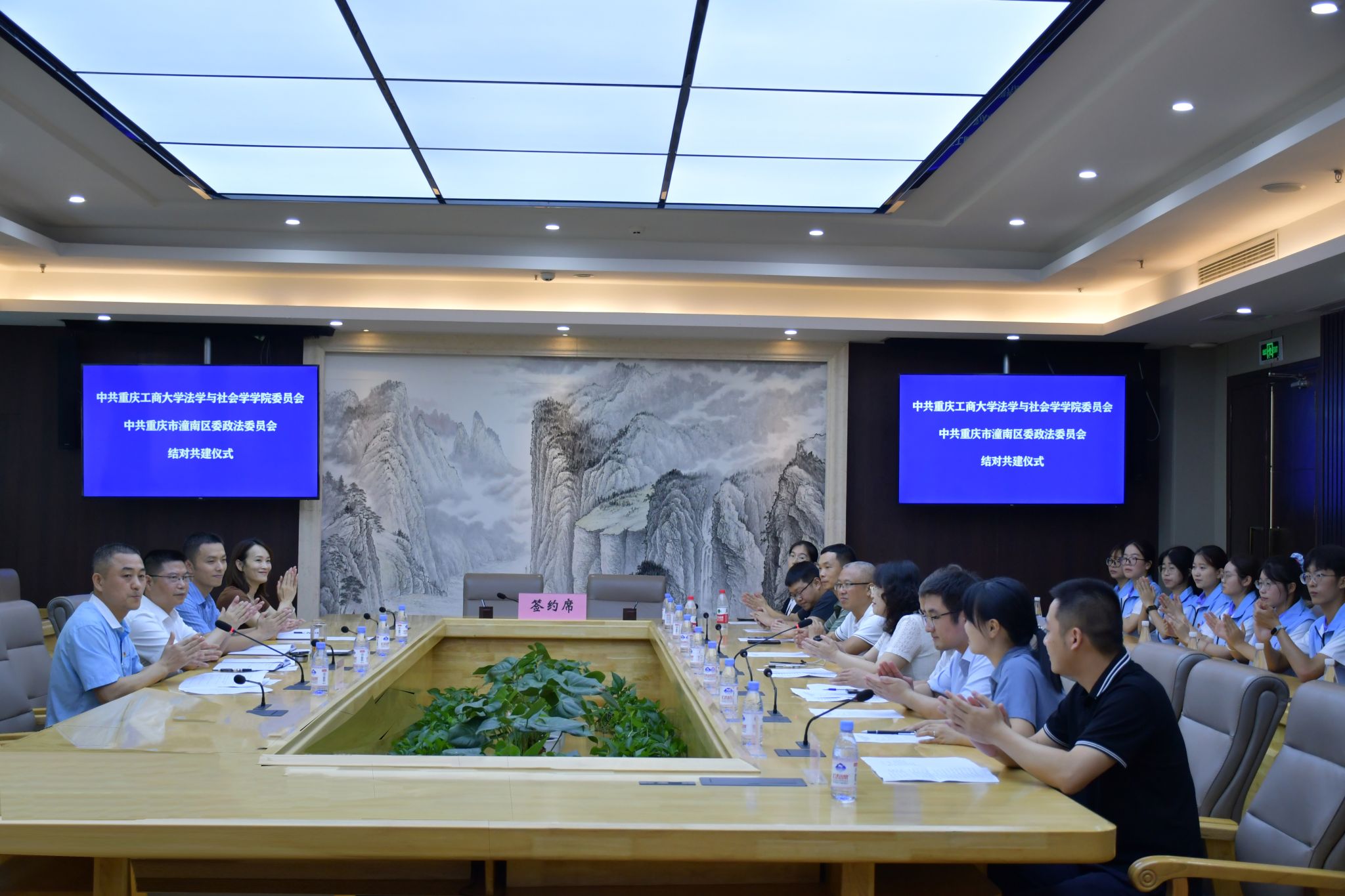 为促进法学教育与司法实务的深度融合,搭建校地共建交流平台,7月15日上午,中共437437必赢国际委员会与重庆市潼南区委政法委员会结对共建签约仪式成功举行。潼南区委政法委常务副书记杨勇、副书记黄伟、政治处主任李羽峰、办公室主任白梅,437437必赢国际党委书记李莉莎、副院长侯明喜、专职组织员陈善国,以及系主任、党支部书记、科级干部、普法志愿服务团学生代表共20余人出席签约仪式。