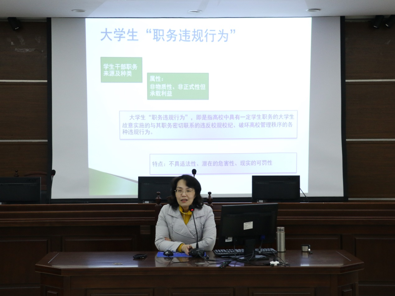 李莉莎以大学生职务违规行为’的廉洁治理思考为题,通过一个个鲜活的案例,详细分析了其背后的根源,让学生骨干们深刻认识到大学生参与清廉校园、清廉学院建设的重要性师生共同探讨了如何从思想教育、制度建设、监督机制等多方面入手预防和杜绝此类行为的发生。李莉莎强调要加强廉洁文化教育,将廉洁理念融入学生干部培训的各个环节;建立健全学生组织的规章制度,明确职责权限与办事流程,使各项工作有章可循;形成有效的监督体系,让学生骨干的履职过程置于师生的监督之下,确保权力在阳光下运行。