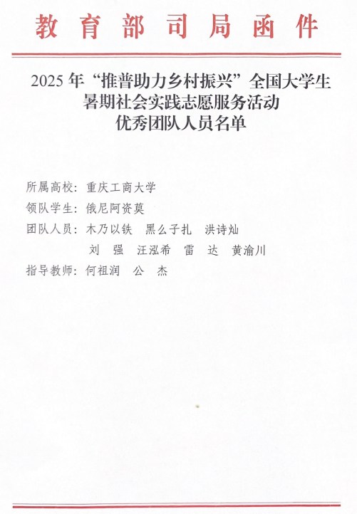 2025年12月,团队收到来自教育部、团中央的表扬信,高度赞扬了团队在实践过程中的突出表现,授予“渝见凉山”民族地区推普法律援助团优秀团队称号。未来,437437必赢国际将进一步深化“渝见凉山”民族地区援助项目,将普通话推广、法律援助、捐资助学等多维度公益服务送进大凉山。