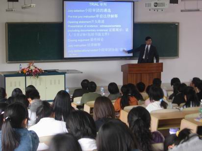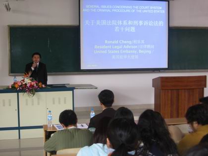 受学校外事处以及法学院的邀请,美国驻华大使馆法律顾问程乐其博士于2007年3月22日下午在博智楼7221教室给法学院师生做了一场题为“关于美国法院体系和刑事诉讼法的若干问题”的学术讲座。