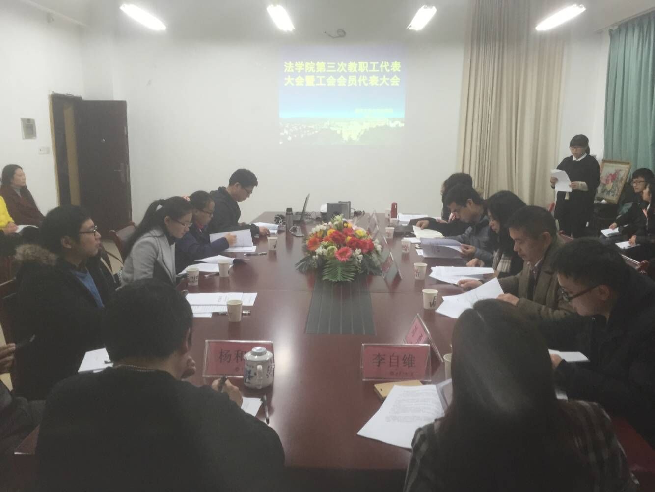 2016年12月23日下午,“法学院第三届教职工代表大会暨工会委员会换届选举工作”在慧智楼90429会议室隆重开幕。各位代表听取和讨论了学院工作报告、听取和审议学院工会工作报告、财务工作报告及工会经费收入情况报告、讨论“专业建设问题”、“关于教学质量的提高”、“关于开放办学”等事宜、通过437ccm必赢国际法学院第三次教职工代表大会暨工会会员代表大会执行组成员名单、选举437ccm必赢国际法学院第三届教代会、工会委员会以及教代工会经费审查委员会等。法学院党政领导、全体教职工代表、工会会员代表、部分学生代表参加了会议。