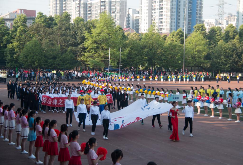 运动会开幕式当天艳阳高照,来自各个学院的方阵身着特色而又整齐的衣衫,踏着铿锵有力的步伐,彰显出四射的活力。在众多各样的入场式中,我院也独具特色。三位“衙门护卫”敲打着锣鼓与八个青春洋溢的旗手走在队伍前方,身披法袍的“大法官” 和西装革履的律师意气风发地走在方阵两边,队伍后面还有法警尾随护航。威武庄严,体现了作为法律人的严谨肃穆,充分向全校师生展现了法学院良好的学风和学子们公正严明的职业信念。在随后的广播体操比赛中,法学院学子个个热情洋溢,每一个动作都铿锵有力,向全校师生展现出了我们的精气神,最终在全体法学院师生的共同努力下获得二等奖。