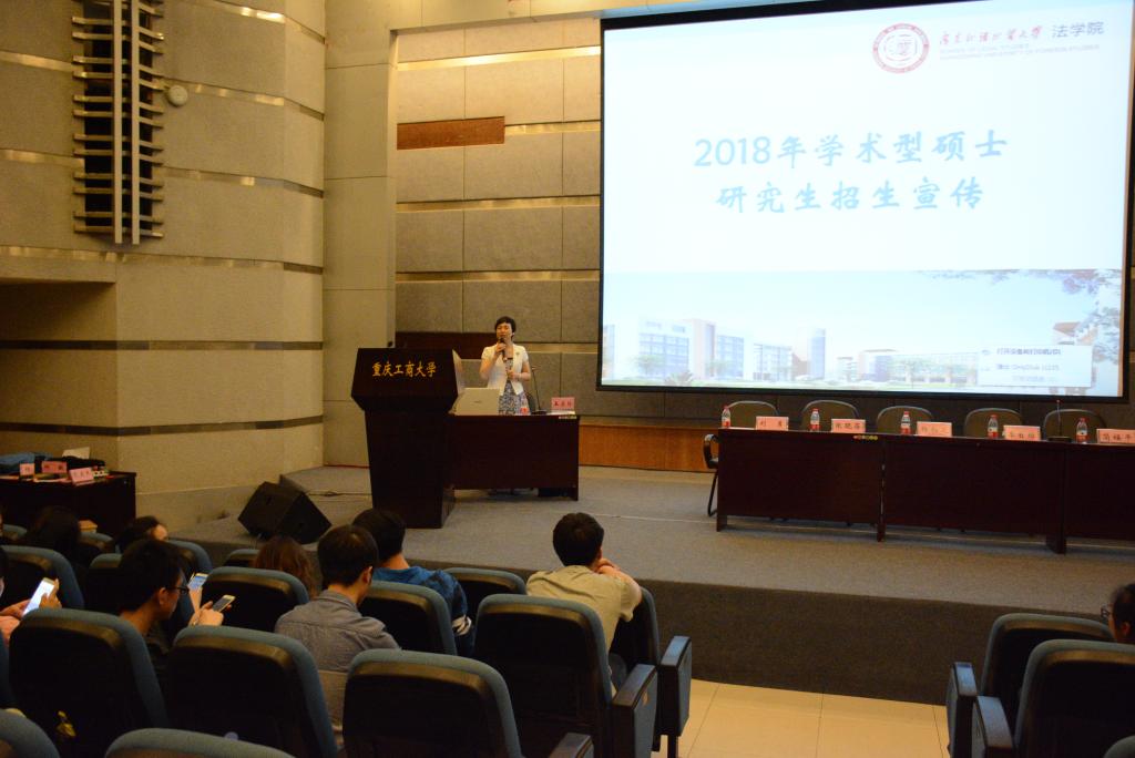 5月24日20:30,广东外语外贸大学法学院王荣珍副院长莅临我院做2018年研究生招生宣传。法学院党总支部书记硕士生导师李自维教授、法学院院长硕士生导师杨和义教授、法学院党总支部副书记硕士生导师简福平副教授、法学院副院长硕士生导师刘勇教授、优秀教师张琨蓓博士、党政办范志军主任、学团办全体辅导员以及法学院全体同学共计400余人参加了此次招生宣传大会。
