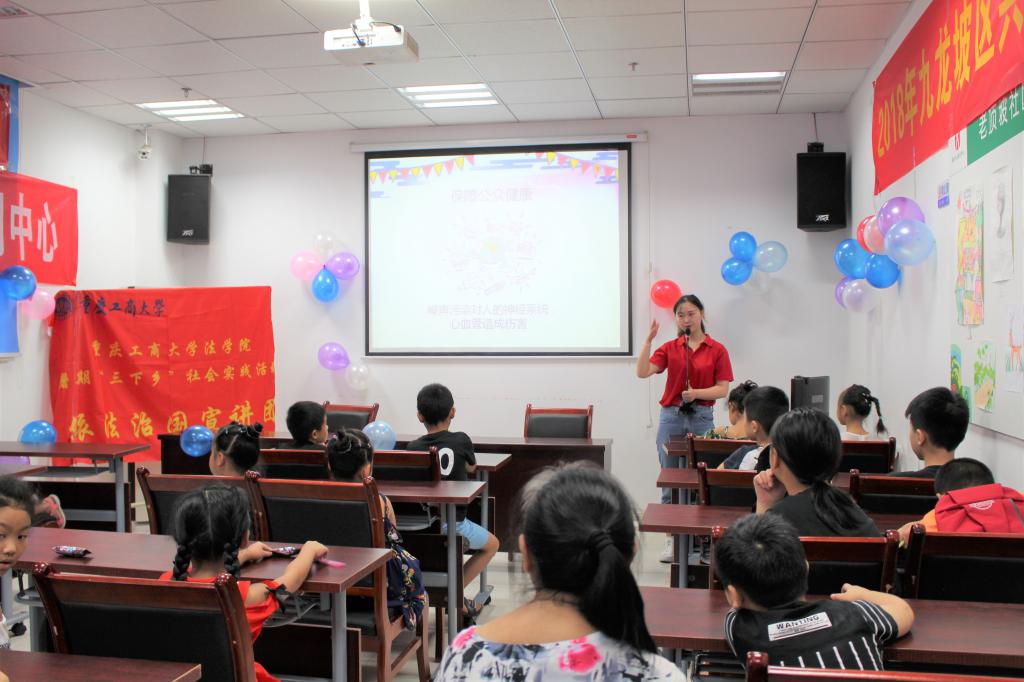 7月23日上午,437ccm必赢国际法学院2018年暑期“三下乡”社会实践依法治国宣讲团的成员们来到九龙坡区石桥铺街道老顶坡社区,为来自当地的30余名中小学生及部分家长开展了法治培训及安全自护教育。