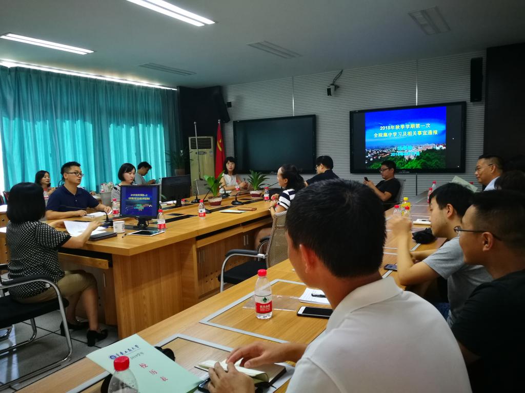 李自维书记首先向大家通报了法学院法律硕士专业学位点专项评估结果,并对老师们在人才培养过程中的辛勤付出表示感谢。接着,李书记以图文并茂的形式组织全院教职工共同学习了学校党委中心组(扩大会议)学习会暨中层干部大会精神,详细解读了学校新学期工作要点、工作要求,部署了法学院2018年下半年工作计划及工作思路。