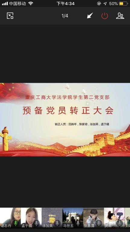 会议第一项议程,大会民主评议发展预备党员范姝岑同志、张家琼同志、徐加英同志、孟于绢同志转为正式党员事宜。四位同志首先向组织就自己在预备期间的表现,渴望转正的态度和决心进行了汇报。接着,大会宣读了四位同志的入党介绍人对其预备期间的考察情况,支部的正式党员们对其转正问题进行了讨论,经支部投票表决,同意四位同志如期转正。最后全体党员宣读入党誓词。