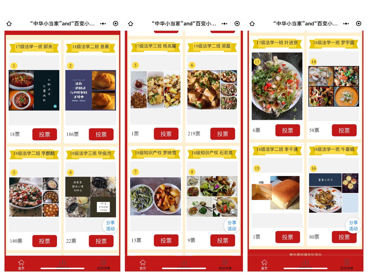 学生赛区,经典欧包、草莓酸奶慕斯蛋糕、芝士抖臀蛋糕等烘培作品层出不穷;水煮肉片、黄焖鲫鱼、香辣虾等经典菜肴令人垂涎欲滴;葡式蛋挞、章鱼小丸子等街头小吃霸占屏幕……一道又一道的精美菜肴和居家收纳妙招充分展示了法学学子的动手能力和生活智慧。