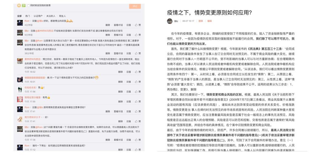 同时,大学生志愿者们利用微博等新媒体平台与关心《民法典》的网友进行互动交流,发布了《疫情之下,情势变更原则如何应用?》等系列文章,详细地解答了情势变更原则适用条件、买卖合同的解除等,尤其是受疫情影响房屋租赁合同的调解办法等社会热点问题更是备受网友关注。