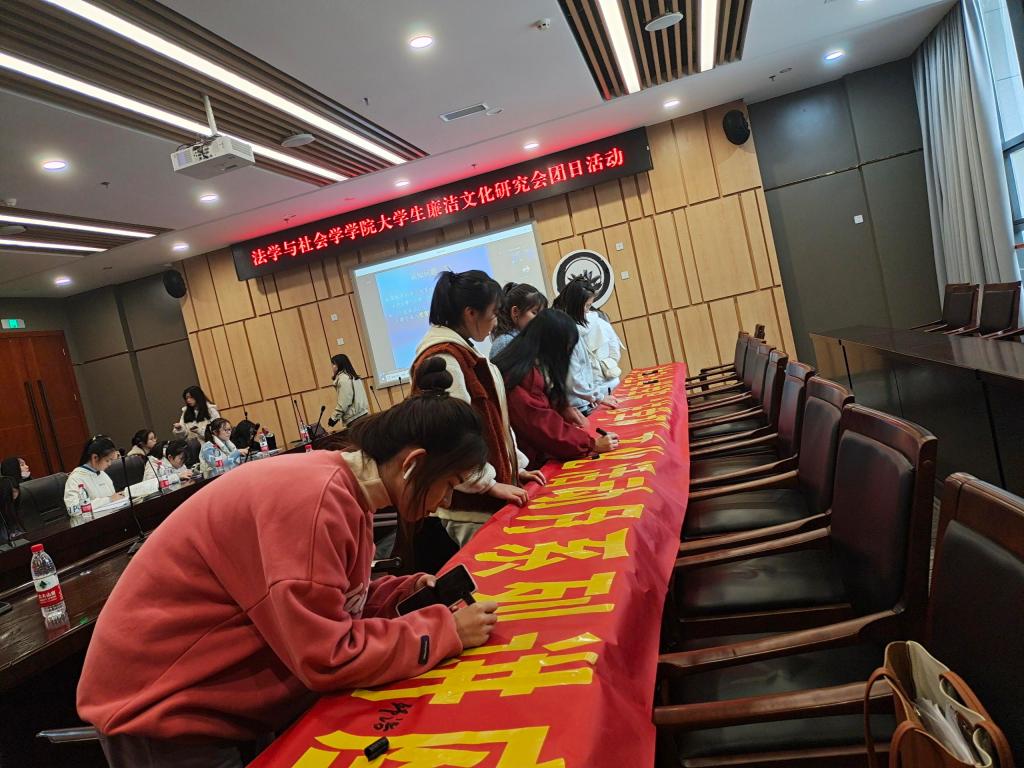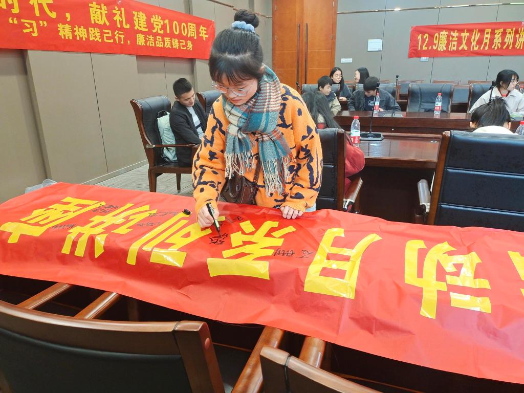 第一个环节是签名活动,支部团员在“12.9廉洁文化活动月系列讲座”的横幅上进行主题签名,通过签名活动增强大学生对于廉洁建设的强烈的参与感和责任感,让大家充分树立“廉洁建设,从我做起”的信心。
