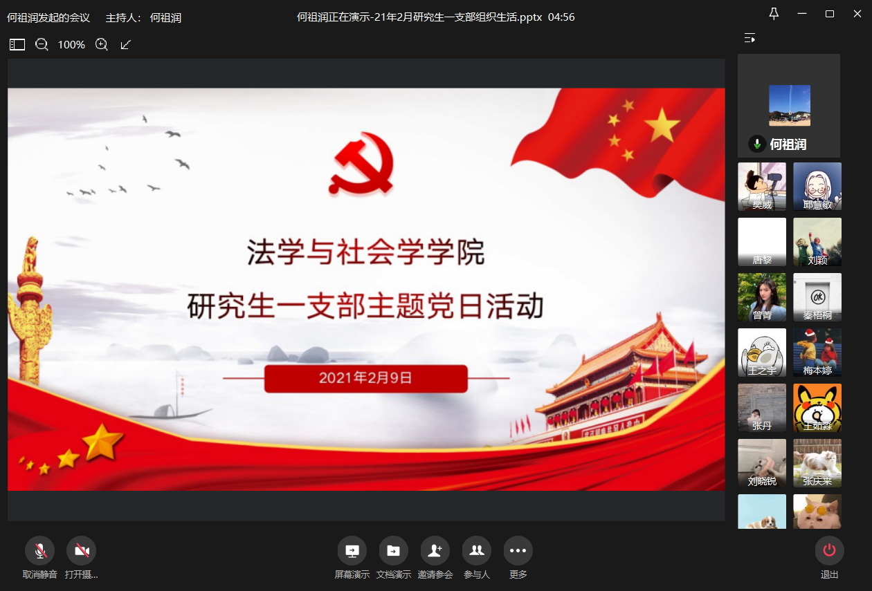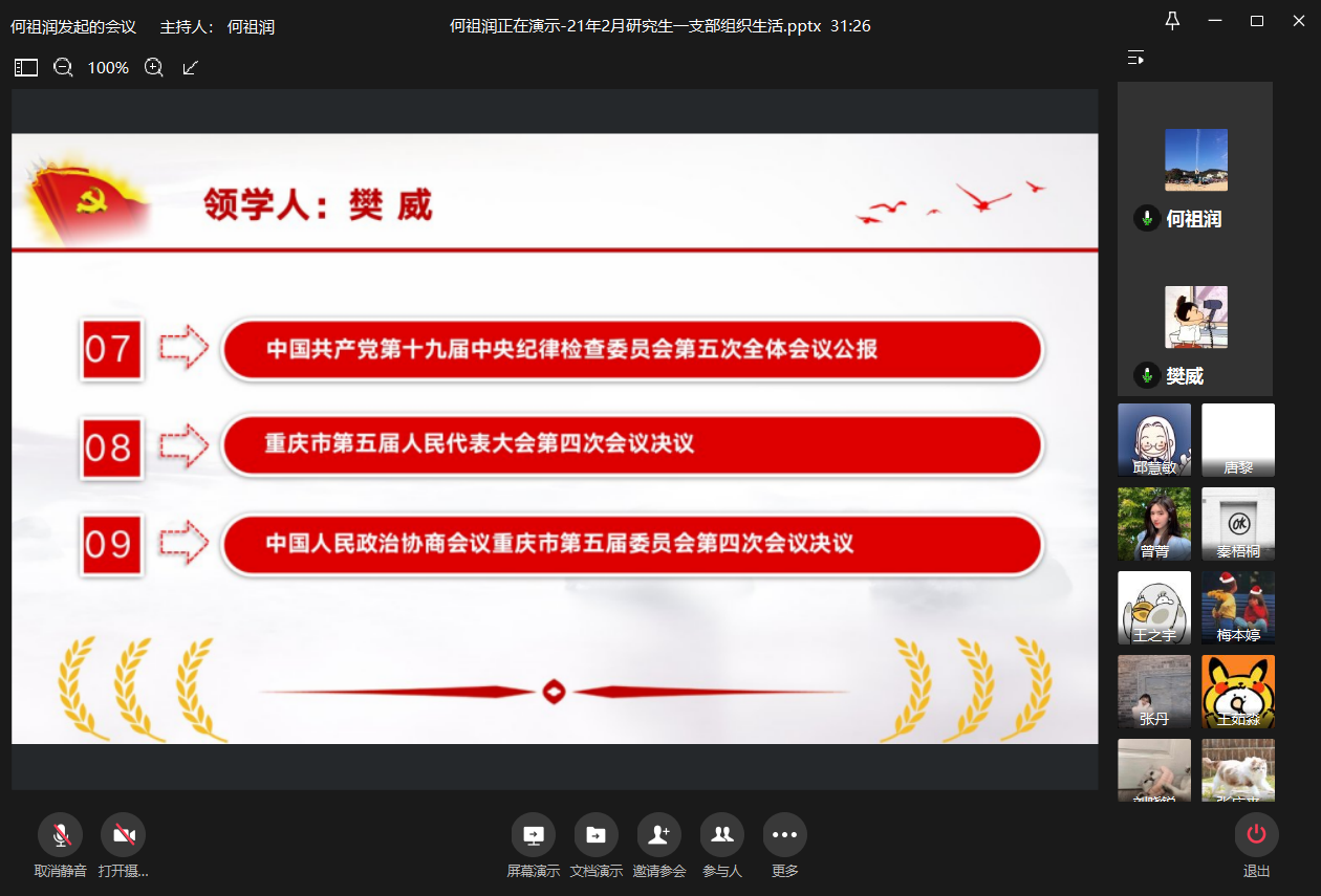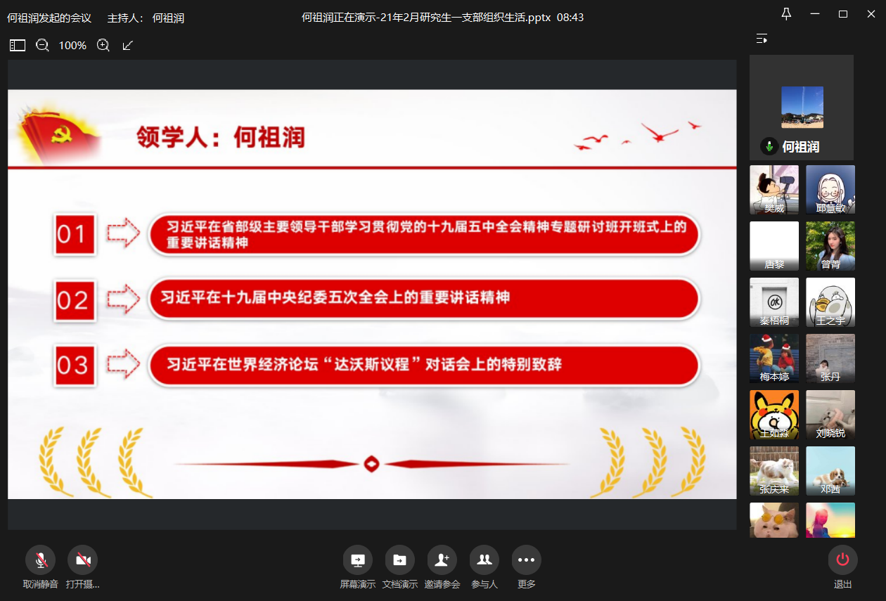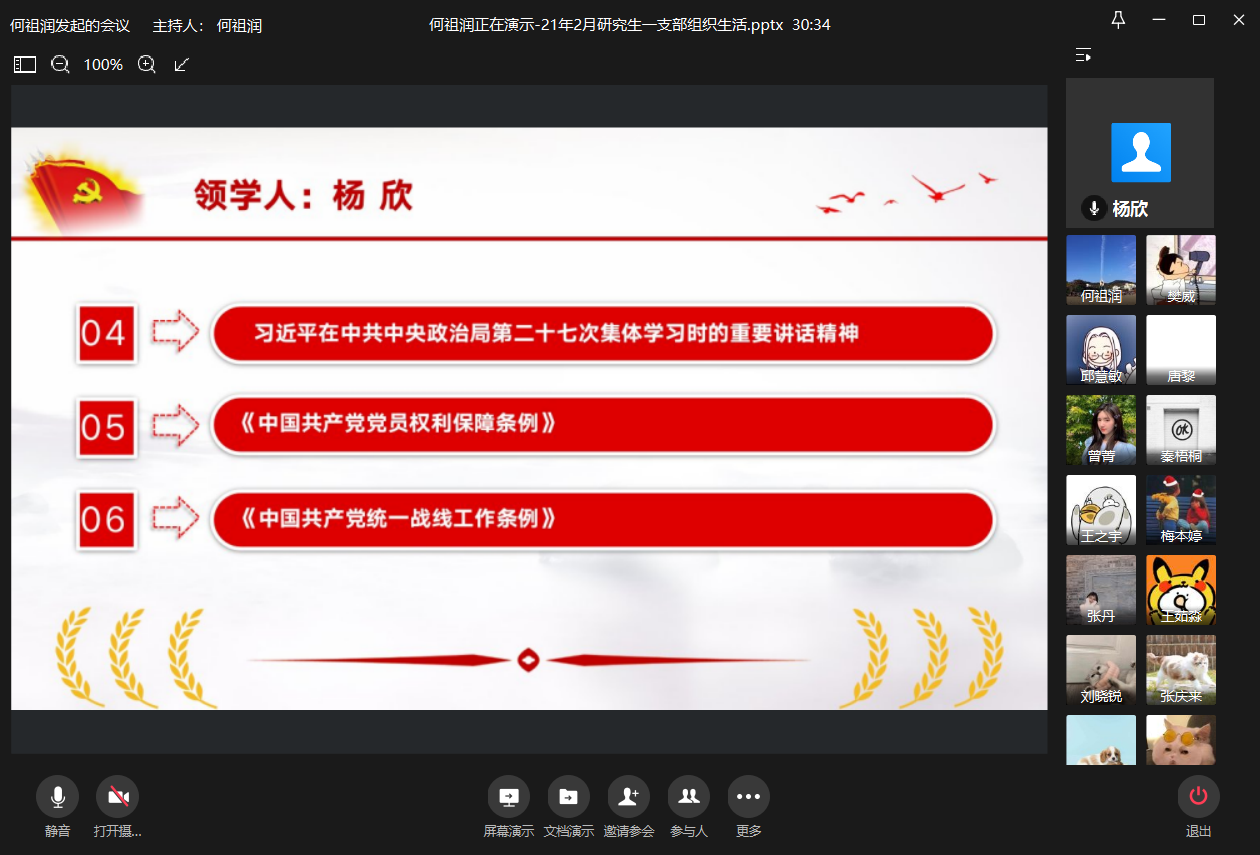 2021年2月9日上午10:00,437437必赢国际研究生一支部通过企业微信平台在线上召开了2021年2月组织生活会。本次会议由研究生一支部书记何祖润同志主持,何祖润、杨欣、刘颖、樊威四位同志带领研究生一支部各党员进行了政治理论学习。