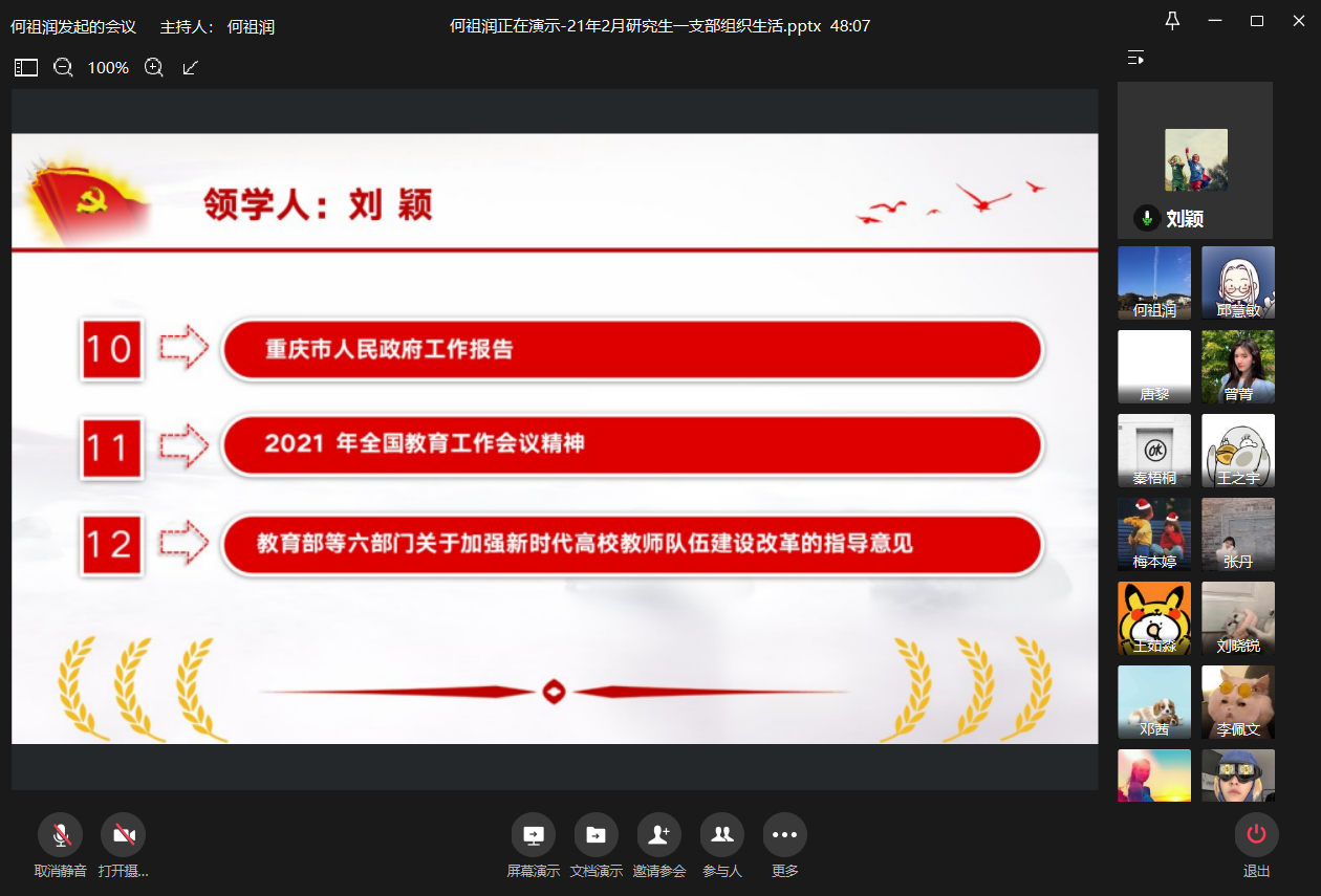 然后,刘颖同志带领大家对“重庆市人民政府工作报告”“2021年全国教育工作会议精神”“教育部等六部门关于加强新时代高校教师队伍建设改革的指导意见”的内容进行学习,重点聚焦2020年重庆政府工作,使各党员对2020年重庆市在生态、民生、经济等方面的发展成果有了一定了解,明确了中央各项决策部署在渝的落地路径。
