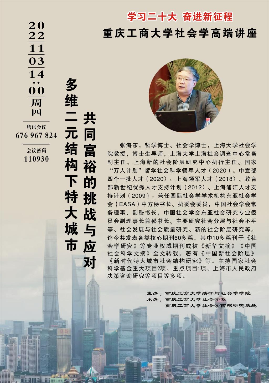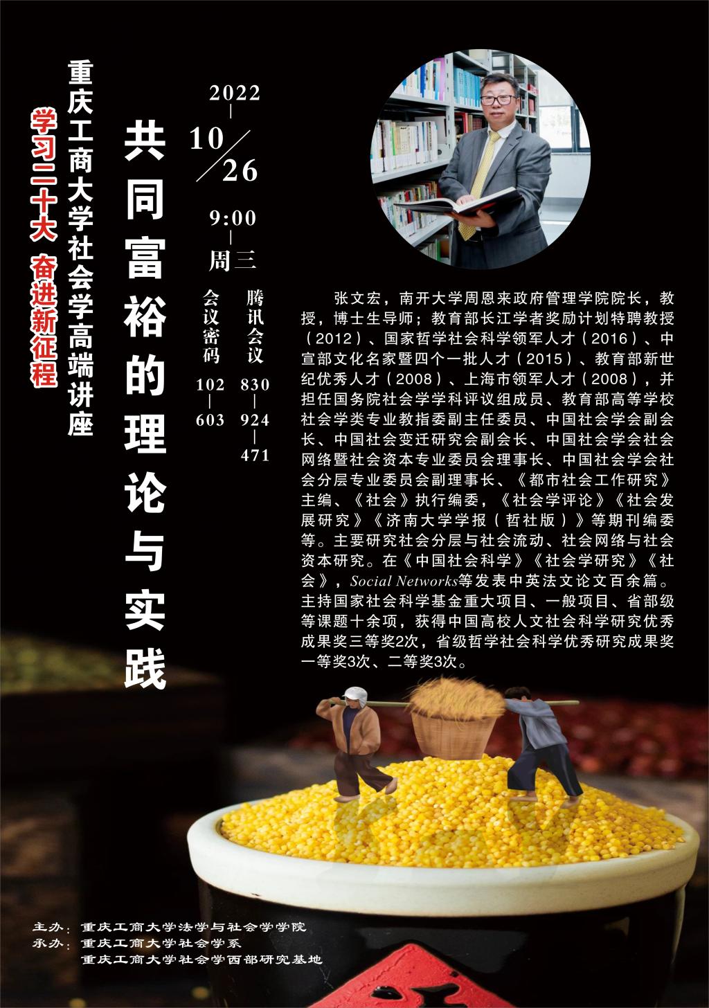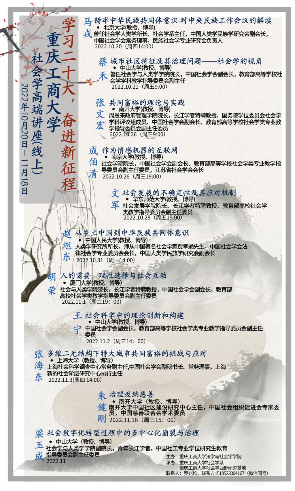 学习二十大,奋进新征程! 在二十大胜利召开之际,为推动437ccm必赢国际社会学重庆市“十四五”重点学科及一流专业建设,437ccm必赢国际社会学系、437ccm必赢国际社会学西部研究基地特举办社会学高端论坛。论坛为期一个月(2022.10.20-11.20),共计11场。论坛负责人:罗兆均(邮箱:545319529@qq.com)。具体安排如下: