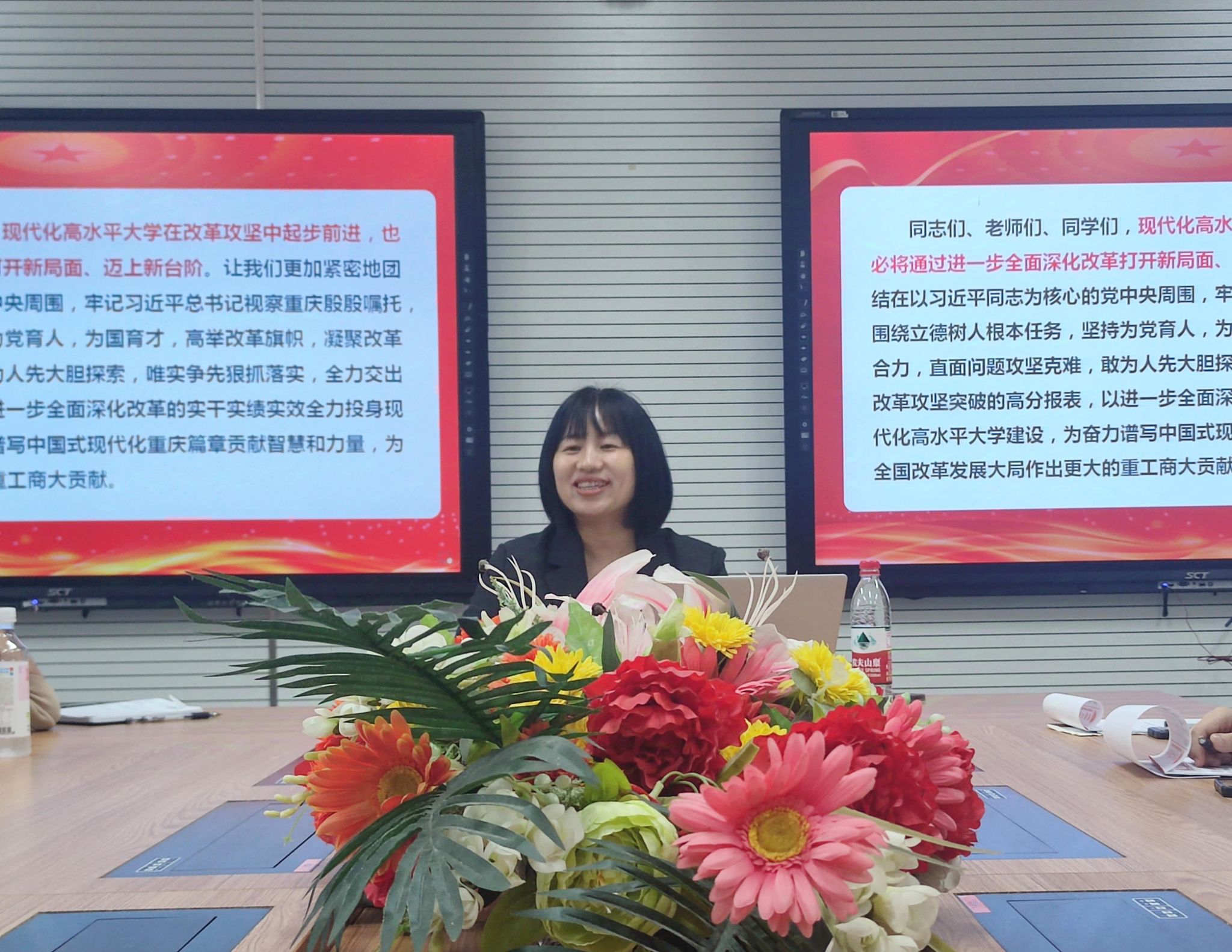 李莉莎谈到,全会结束以来,全国、全市、全校都掀起了学习全会精神的热潮。她说,全会精神应常学常新,每次学习都有全新的收获,宋院长从经济学专业角度出发,详细讲解了全会内容,并结合法学、社会学学科特色,为学科融合发展提供了新思路,值得我们学习思考。我们要把全会精神作为“两地两高战略”的提纲性教育文件,全面推动党的二十届三中全会精神的一体学习、一体领会、一体贯彻。