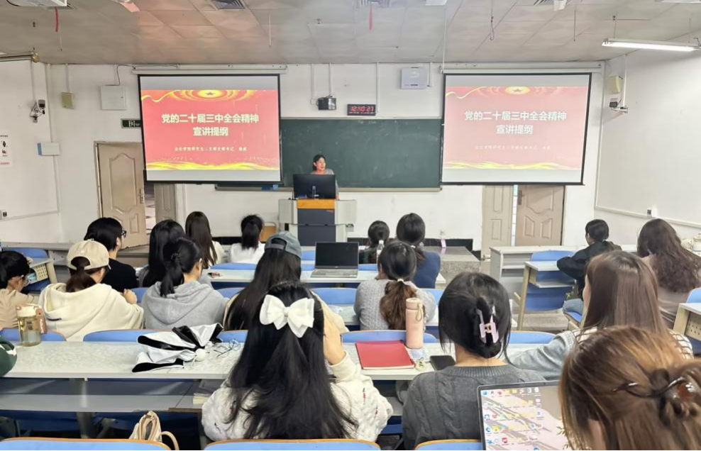 会议共有两项议程。一是支部书记杨威老师宣讲党的二十届三中全会精神。杨威老师从党的二十届三中全会在党和国家发展过程中的重要作用谈起,结合学生党员身份,和同学探讨了作为学生党员,应该怎么样深入学习领会习近平总书记在党的二十届三中全会上的重要讲话精神并将其转化为自己的实际行动。二是本月组织生活会学习。肖渝领学了携手推进现代化,共筑命运共同体 ——在中非合作论坛北京峰会开幕式上的主旨讲话内容;庞宇欣带领大家学习习近平总书记在庆祝全国人民代表大会成立 70 周年大会上的讲话内容;冷梦婷领学了中共中央政治局9月26日会议精神;谭海霞领学了习近平总书记在庆祝中华人民共和国成立75周年招待会上的讲话精神。