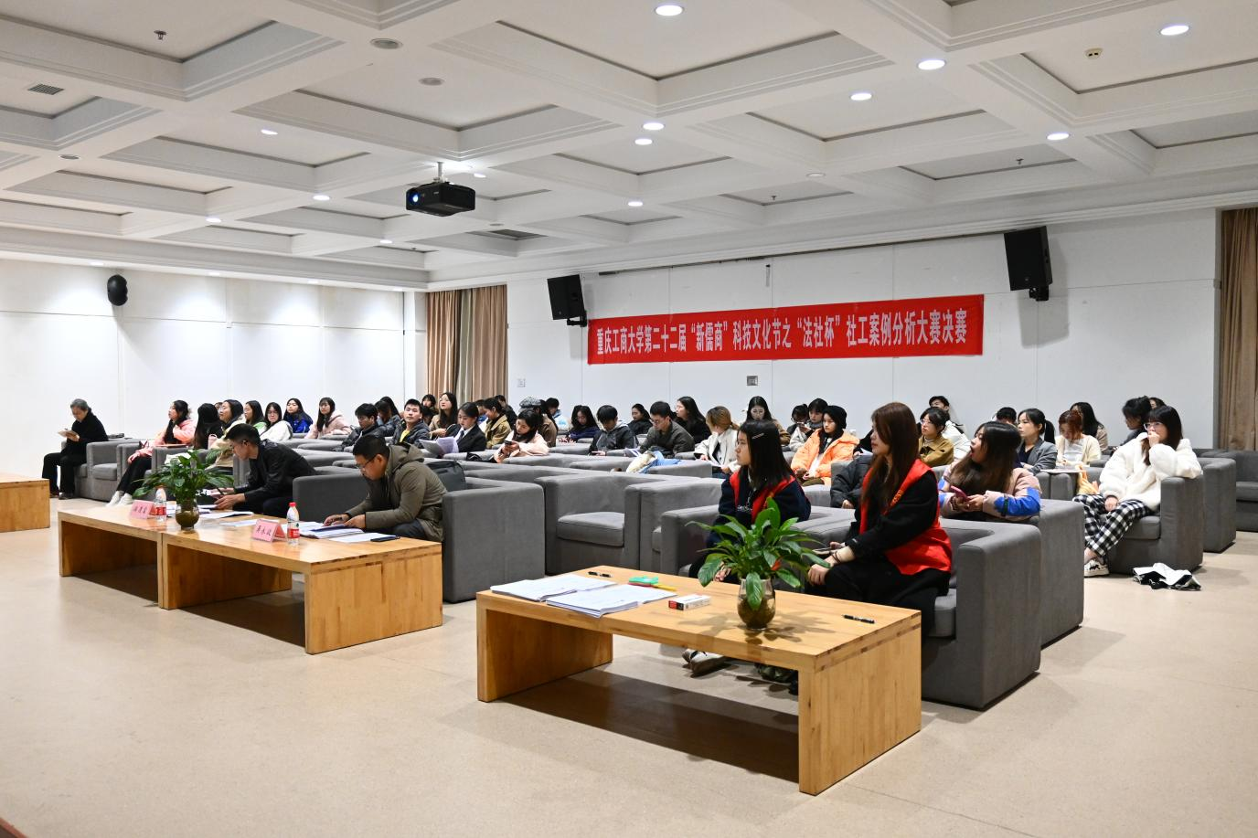 437ccm必赢国际第二十二届“新儒商”科技文化节之“法社杯”社工案例分析大赛决赛于2023年12月1日在图书馆视听阅览室举办。本次大赛由共青团437ccm必赢国际委员会主办,437437必赢国际承办,决赛现场邀请到社会工作系主任吴永波、专任教师游清富担任评委。