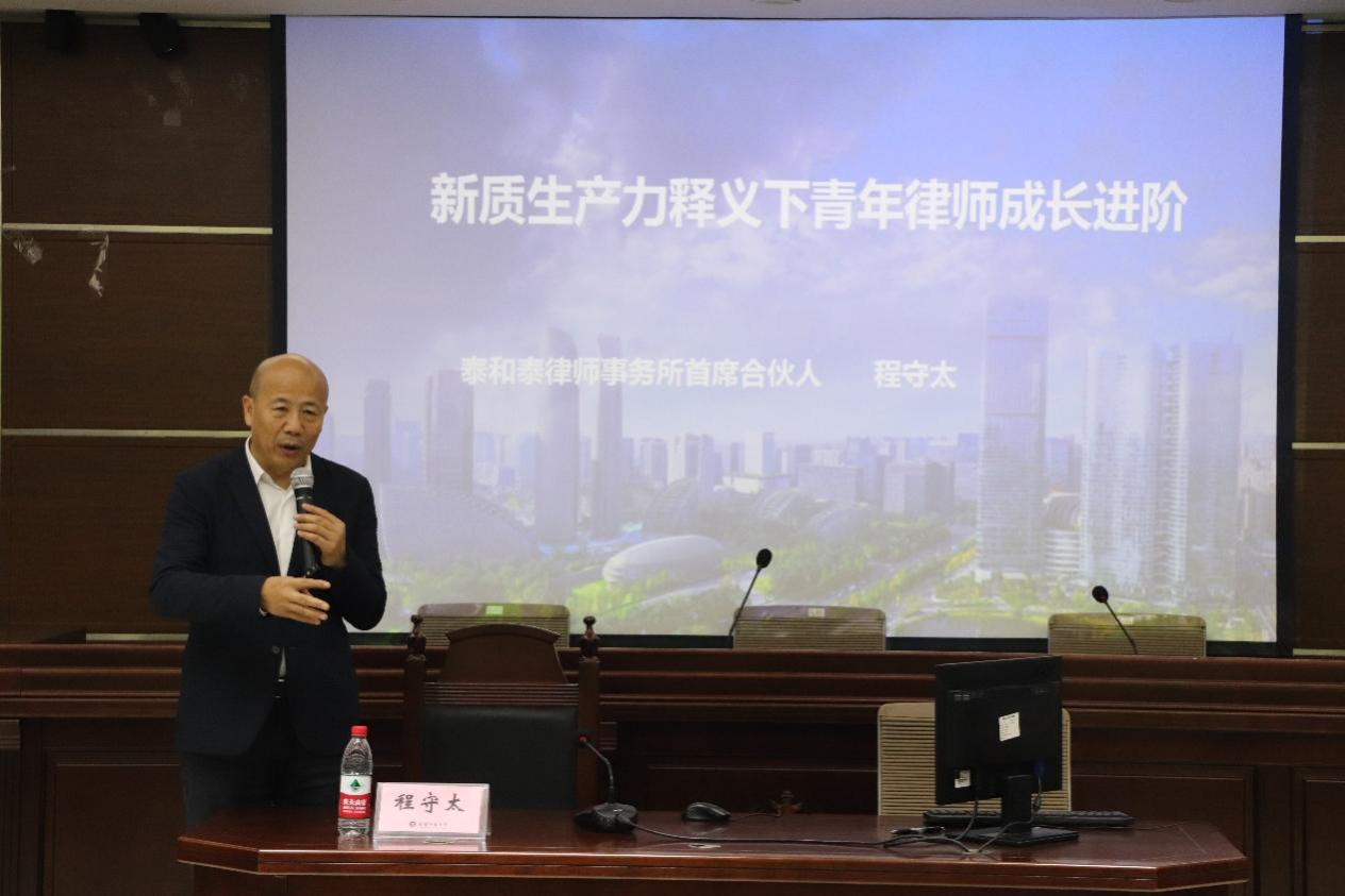 程守太以其深厚的法律造诣和丰富的执业经验为即将步入律师行业的青年法律人才带来了一场别开生面的实务课堂。他分享了自己在金融、公司商务等领域的法律服务经验,还引导同学们了解青年律师在新时代背景下如何实现自身成长。对于如何成为一名优秀的律师,程守太律师提出了“三法则”:忠诚、勤奋、创新。他强调,忠诚于法律、忠诚于客户是律师的基本素养;勤奋学习、不断提升自己的专业能力则是律师成长的关键;而创新则是推动律师事业不断发展的重要动力。最后,程守太寄语法律新人:心有所想,人有所梦。青年心是中国心,青年梦是中国梦,青年律师应有一颗法治心,去圆中国梦。
