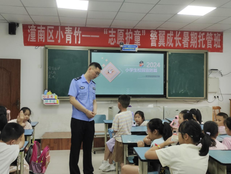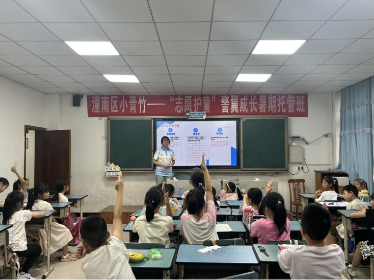 开班当天,公益课堂邀请到潼南区公安干警作为防诈宣传员走进课堂带来一堂生动的小学生防诈骗宣传课。一线警官结合实际案例向青少年们详细介绍了游戏充值、网购刷单等当今社会常见的诈骗手段和类型,为孩子们开展了生动形象的防范指导,志愿者们在互动环节中结合专业知识提供了切实可行的防范建议和方法,为青少年的健康安全成长保驾护航。