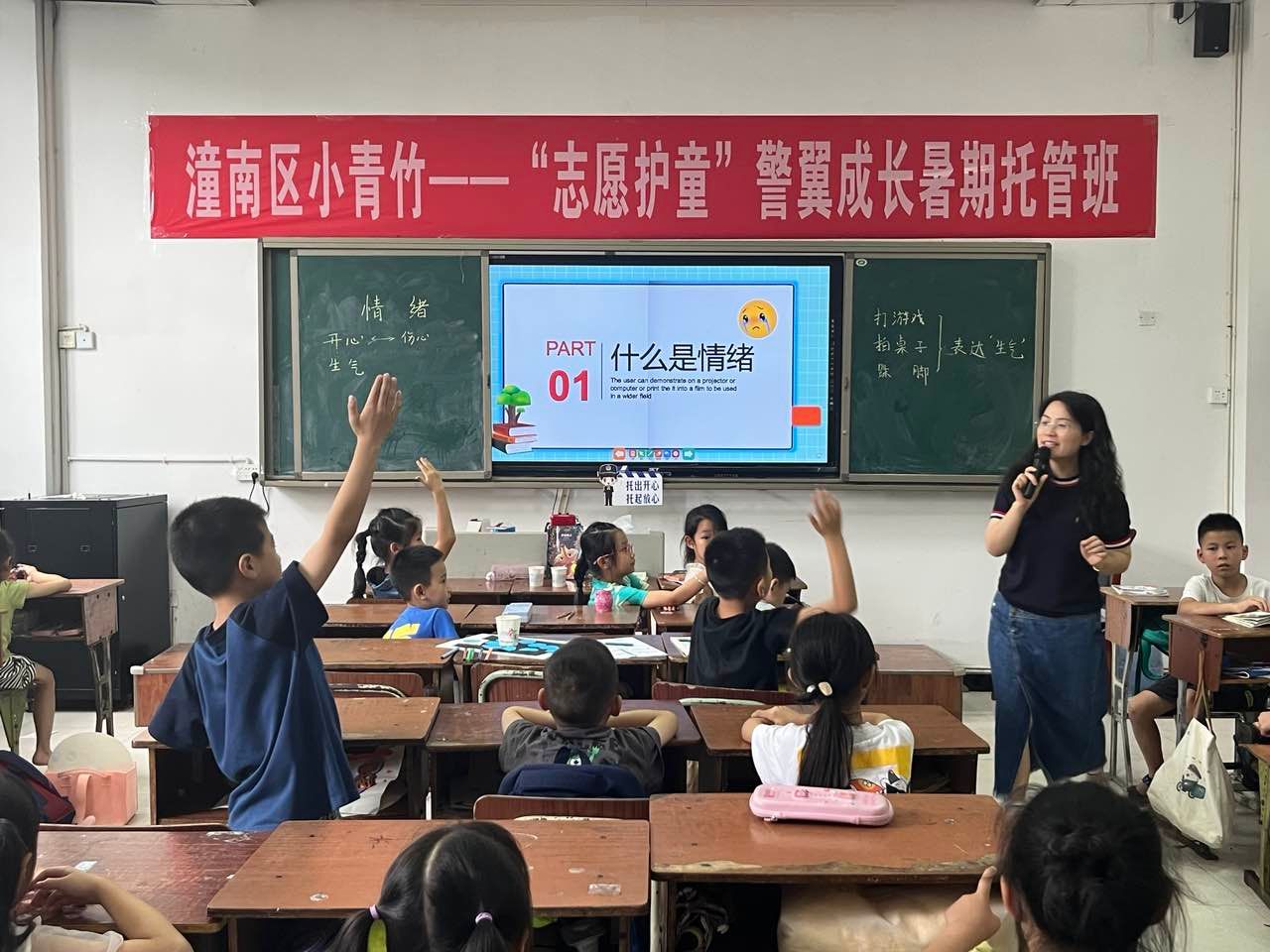 来自潼南区朝阳小学的专业心理辅导老师通过列举身边的一个个具体实例引导孩子们明白“情绪”对人的影响,传授给孩子们处理情绪和解决矛盾的科学方法。一次次互动使学生不断正确认识自我,增强调控自我、承受挫折、适应环境的能力。437ccm必赢国际社会工作专业的大学生志愿者们充分发挥专业优势,利用认知重构和行为训练等团体辅导技术,通过绘画、游戏、角色扮演、手语操、做手工等方式促进青少年的全面发展与积极改变。