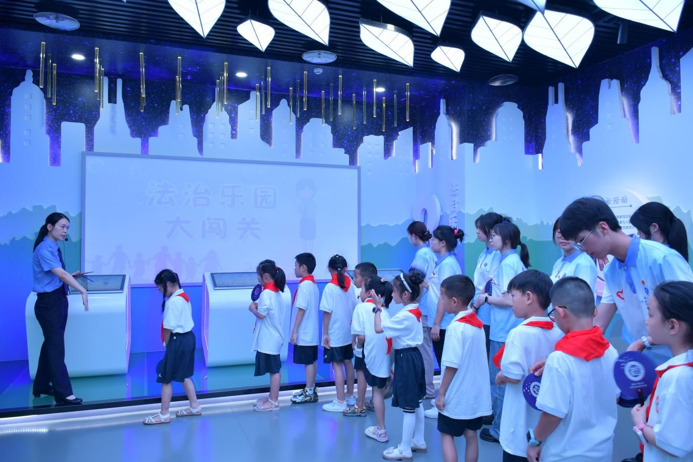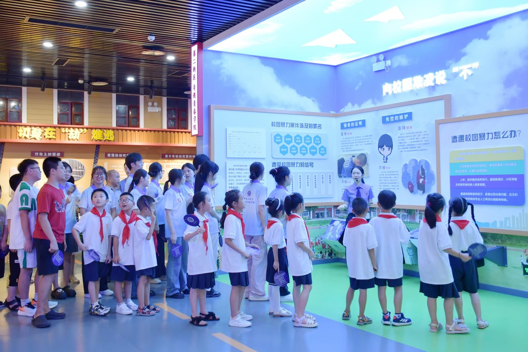青年普法志愿者充分利用重庆市人民检察院青少年法治教育基地的设施优势,通过图文并茂的知识展牌、妙趣横生的闯关答题、身临其境的VR体验,让青少年感受了一次具有趣味性、科技感的普法之旅。在检察院讲解员的带领下,青少年还参观了基地设立的“抵制校园霸凌”“网络安全防范技巧学习”“珍爱生命、远离毒品”等多个主题教育展馆,将法治知识融入现场研学之中,不仅让青少年学习了的消防知识、地震求生等知识,还使青少年在游戏中培养了法治思维,提高青少年法律意识和法律素养,助推青少年学法、懂法、守法和用法。
