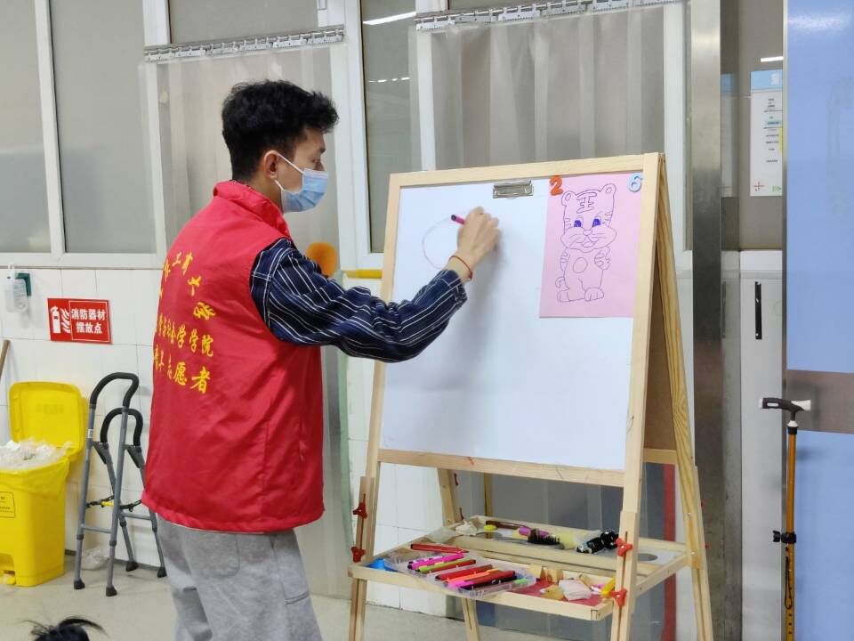 下午两点,小朋友们刚从睡梦中醒来,突然身边就多了这么一群大哥哥大姐姐,将他们接到了渝西医院的活动室里,平日医院中的高墙挡住了他们对这世界的渴望,在这温暖的春日里,他们不能看到这春意盎然的自然,更不能像其他小孩那样在公园里奔跑打闹或是嬉戏玩耍。但是志愿者们来到了他们身旁,带来了画笔为他们绘画出了可爱的动物,为他们单调的生活增添了许多的乐趣。