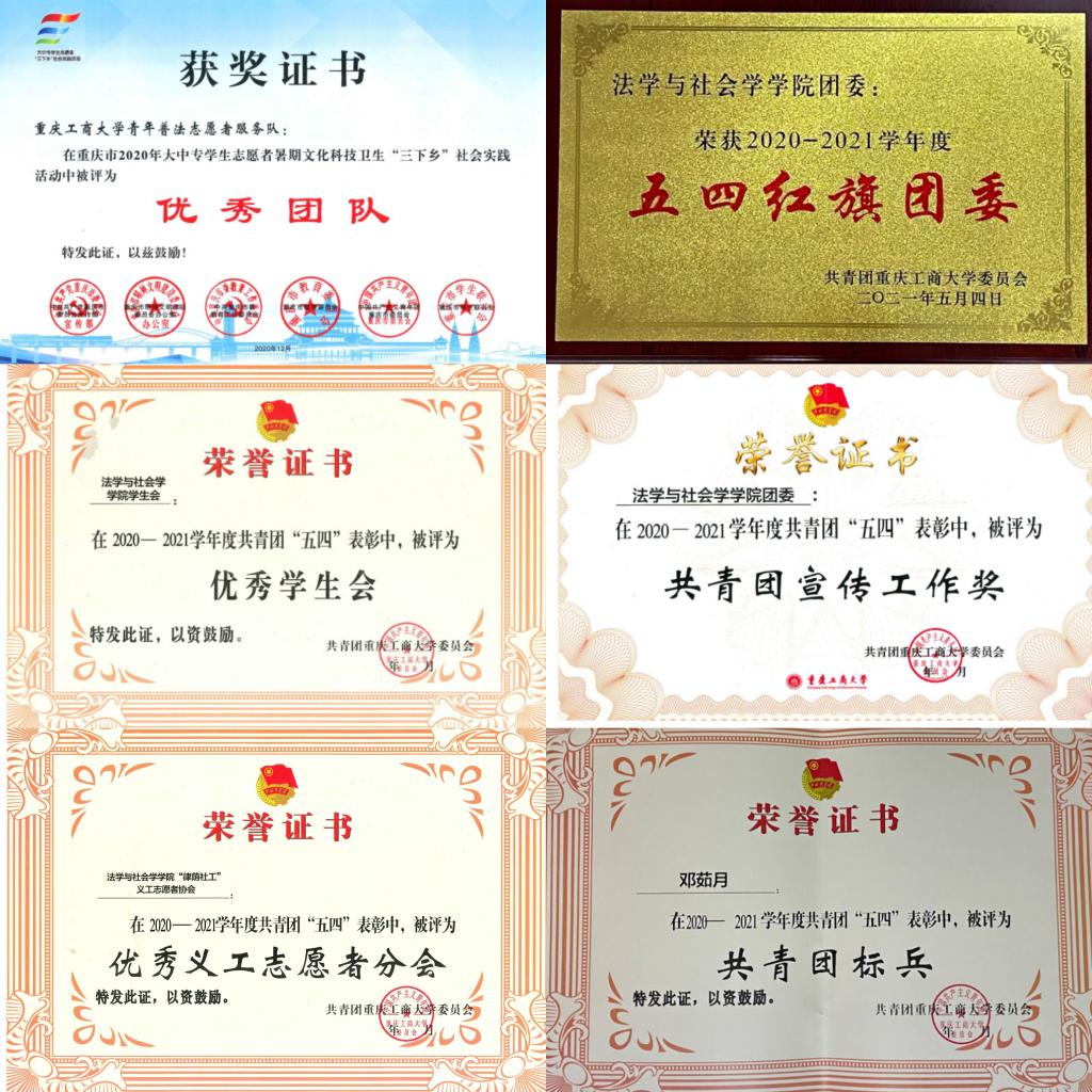 集体方面:437437必赢国际重庆市青年普法志愿者服务队获全国、重庆市社会实践活动优秀团队、437437必赢国际分团委获五四红旗团委、共青团宣传工作奖、437437必赢国际分团委学生会获优秀学生会、437437必赢国际“律荫社工”义工志愿者协会获优秀义工志愿者协会。