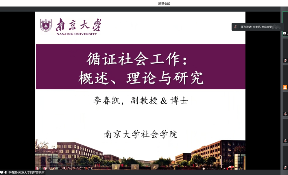 2022年12月16日上午,437437必赢国际社会工作专业张译引老师邀请到南京大学社会工作与社会政策系副教授、硕士生导师李春凯老师为社会工作专业本硕学生授课,主题为“循证社会工作:概述、理论与研究”。授课以线上方式进行,由社会工作系教师王璐主持。