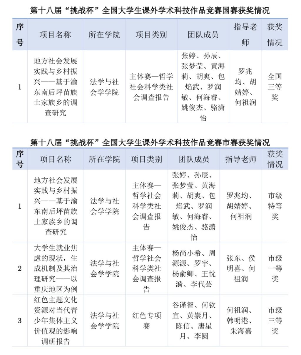 我院罗兆均等老师指导的张婷团队的“地方社会发展实践与乡村振兴-基于渝东南后坪苗族土家族乡的调查研究”荣获市级特等奖、全国三等奖。张东等老师指导的杨尚小希团队的“就业焦虑的现状,生成机制及其治理研究——以重庆地区为例”荣获市级一等奖。何祖润等老师指导的谷谨智团队的“红色主题文化资源对当代青少年集体主义价值观的影响调研报告”荣获市级三等奖。