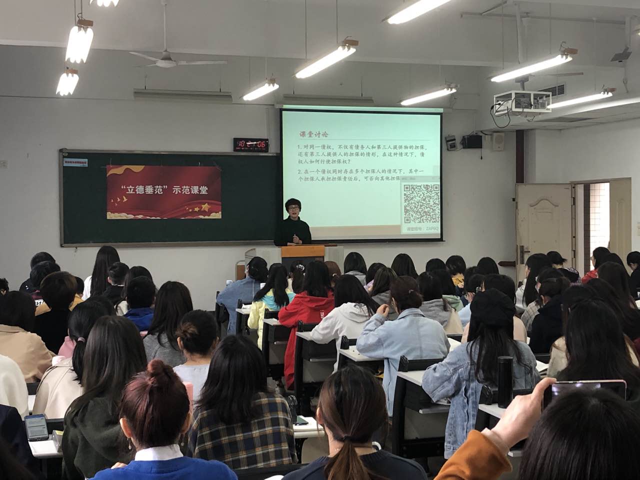 本次示范课程围绕共同担保人之间可否相互追偿这一主题展。王老师从追偿权的类型及相关法律规定入手,引出担保人之间的追偿权问题,引导学生思考,通过“雨课堂”投票环节收集学生的看法,了解学生对相关知识点的掌握情况,在此基础上梳理出争议的焦点,进而展开分析论证。授课过程中,王老师将公平、诚信的思政元素引入课程教学中,强调这一问题的解答,应充分考虑担保人相互之间的利益平衡,尊重担保人的意思自治,倡导诚实守信,节约追偿成本。同时注重学生逻辑思维能力和实践能力的训练,体现了育人理念。为了上好本次示范课程,王老师精心准备,综合运用了多种教学方法和手段,积极与学生交流互动,积极引导学生思考,旁征博引,案例丰富,有效提升了课堂的吸引力,听课的老师和学生都表示受益匪浅。