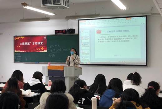 为切实开展“立德垂范”新老教师结对子、传帮带活动,提高教师教育教学水平。12月3日下午,437437必赢国际开展了《行政法与行政诉讼法》 “立德垂范”示范课堂活动,由党员教师胡婧主讲。学院班子成员、新进教师、行政人员和部分党员教师参与了此次示范课活动。