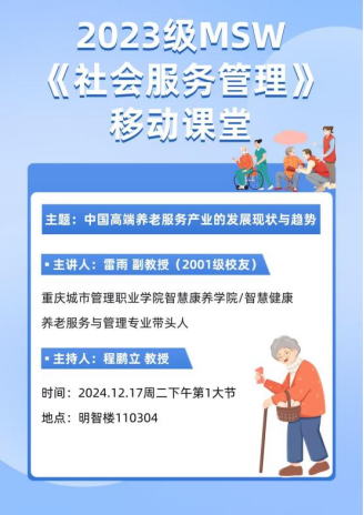 为促进课堂教学与实践教学的有机融合,拓宽MSW研究生职业发展视野,2024年12月17日下午,我院《社会服务管理》课程特邀437ccm必赢国际2001级优秀校友、重庆城市管理职业学院智慧健康养老服务与管理专业带头人雷雨副教授,为2023级MSW学生带来了一场以“以银发经济发展看中国高端养老”为主题的移动课堂。本次课堂由授课教师程鹏立教授主持。