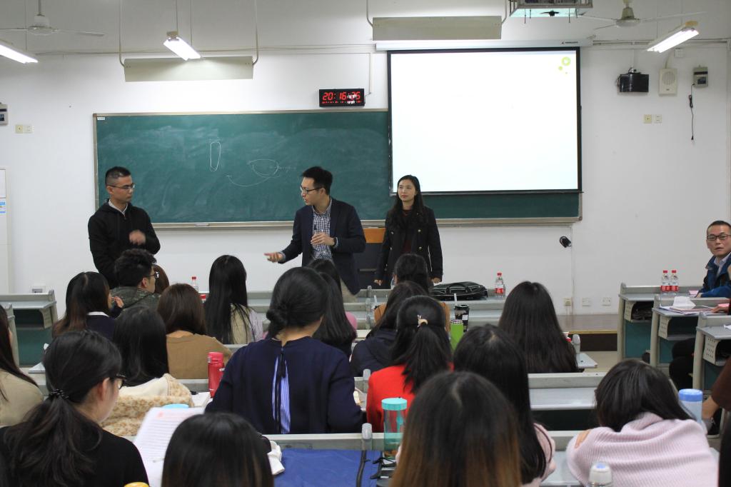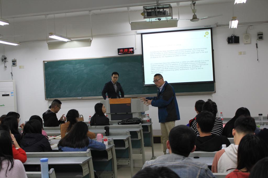 首先,向文博士从国内外科学政策等方面详细介绍了转基因产品风险评估问题,并评述了转基因产品的审批流程。交流期间,我院张忠民教授就向文博士的话题进行的详细而深刻的阐述与回应。继而向文博士就其研究的基因修饰技术做了简明扼要的介绍,让师生们对基因修饰工程技术有了全新的了解。