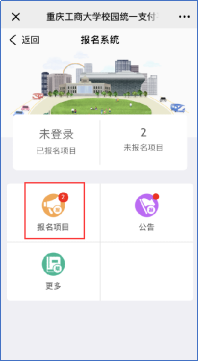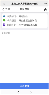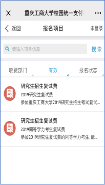 如上图,单击左上角【报名系统】,在打开的页面后,选择“报名项目”,即看到有两条关于研究生复试收费的项目,如果考生为“同等学力”类型的考生,请选择“2019同等学力考生复试费”进行缴费,其余一般考生直接点击第一个“2019研究生复试费”进入缴费即可,如下图所示: