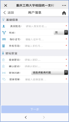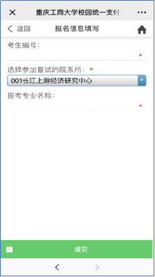 可关注我校财务处公众号后,根据上述提示进入第一个“2019研究生复试费”后,在弹出的登录页面中,选择【注册】按钮后,进行考生个人信息填报,填写完成后点击【下一步】按钮,继续进行报名信息填写,如下图,选择考生参加复试的院系所单位名称,并填写报考(调剂)专业名称,提交信息,如下图所示: