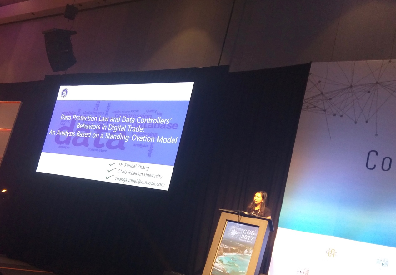 在这次会议中,来自我院的张琨蓓老师的两份投稿均为会议所录用。她分别于9月19日下午发表大会演讲“数字贸易背景下个人数据保护法和数据控制者行为:基于‘起立鼓掌模型的分析'”,并于9月21日在Complexity and Law分会上,与荷兰知名教授Aernout Schmidt合作进行了题为“用代理人模型分析知识产权问题”的报告。在这两场演讲中,张琨蓓博士都展示了复杂系统科学在法学领域,特别是知识产权和数据安全领域的应用,其研究成果获得与会人员的高度评价。