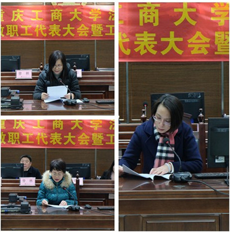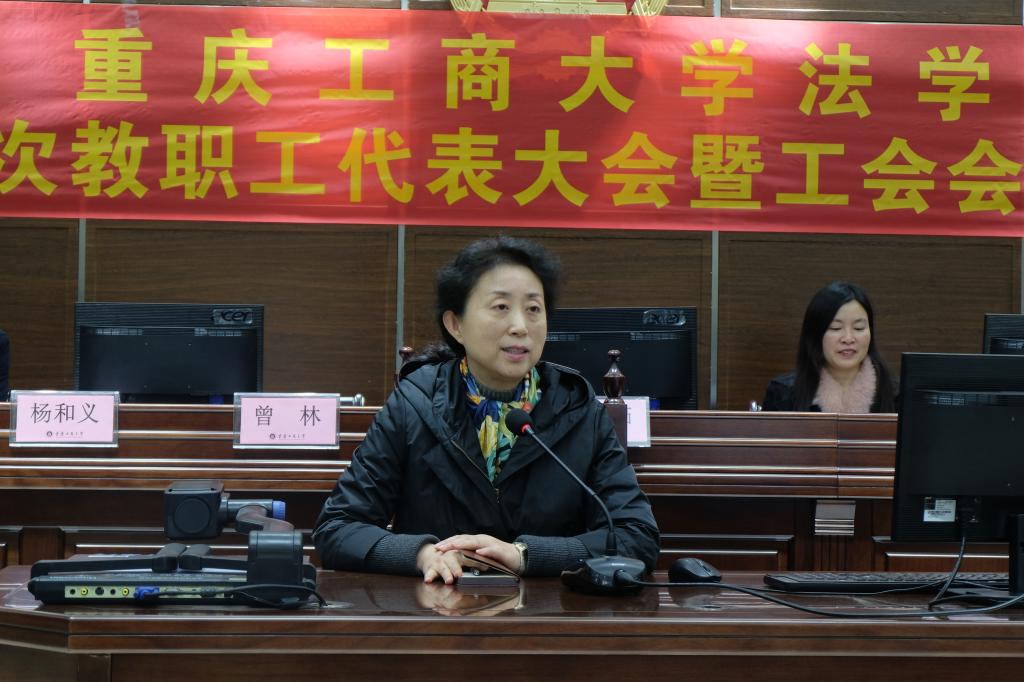 校党委书记李春茹发表讲话。首先,她衷心祝贺此次大会的召开,并对全院教职工进行了亲切问候。她说此次大会是学院教职工民主政治生活中的大事,是教职工行使民主管理权利的重要渠道,是学院凝聚力量、汇聚智慧,共同总结、回顾、思考学院办学成效,描绘未来发展蓝图的盛会。随后,她对学院在近几年取得的成绩表示祝贺。她说,近几年学院取得了一些标志性成果,迈上了一个个新台阶,一步一个脚印向前发展,2017年成功获批重庆市级重点学科、首届法学硕士生毕业、挑战杯获全国三等奖、重庆市特等奖等,这些成绩的取得,具有里程碑的意义。同时,她认为其他重要工作所取得的成绩所带来的正效应也不能低估,审核评估顺利通过、积极申报法学硕士点、学院班子认真努力、办学硬件条件的改善,都将引领全院师生员工为“共同家园、共同梦想、共建学院”而努力。接着,李春茹书记对学院未来发展提出了希望。她指出,一是学院全体教师要通过讨论进一步集思广益,深化对学院办学定位、办学特色的认识,围绕定位和办学特色,实现目标;二是要积极准备,蓄势待发,寻找学院未来新的增长点;三是要整合资源,突出特色,继续加强开放办学并取得实质突破;四是要完成法硕点合格评估、知识产权专业评估等重要工作而不断发展进步。最后,他希望在2018年新的一年,在新的时代和学校领导下,在学院班子带领下,学院取得新的成绩。