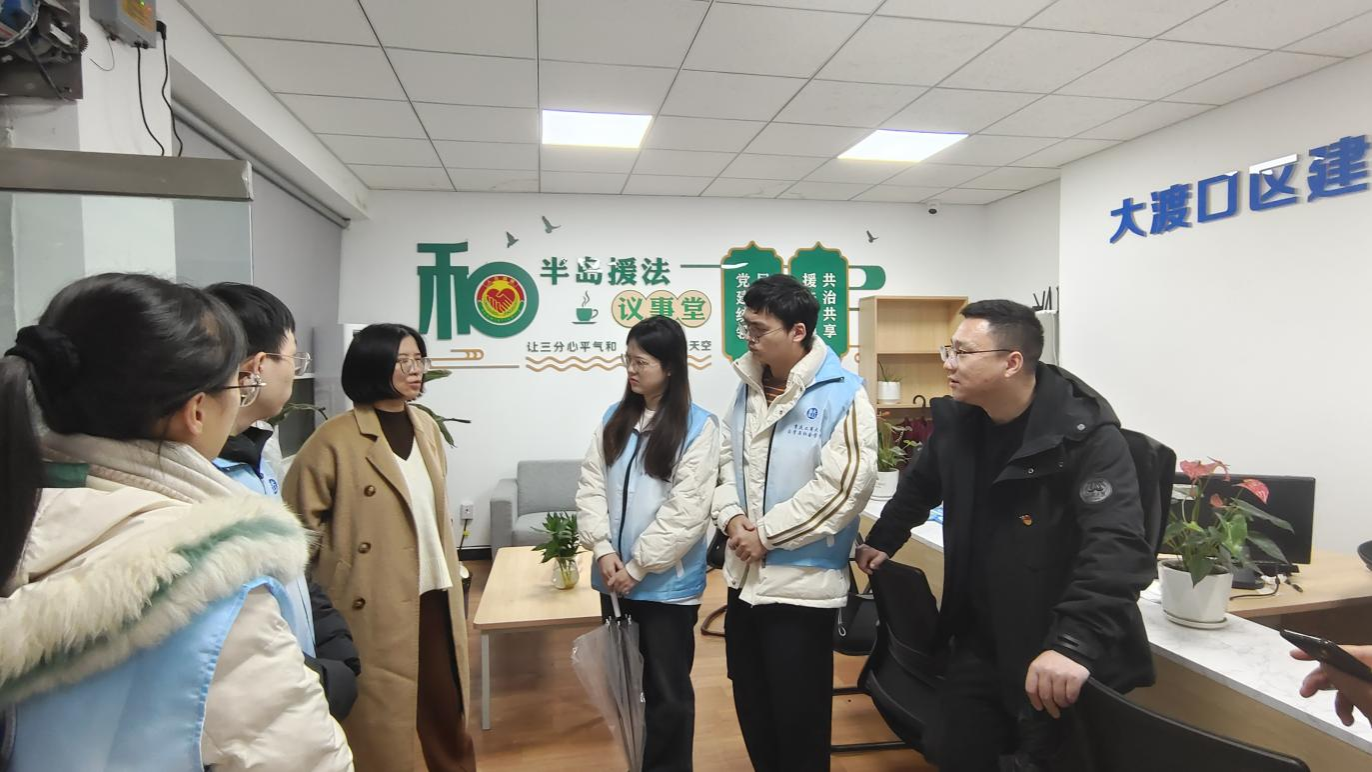 在建胜镇党委委员、政法委员周奇仕的带领下,普法队师生走进建胜镇综治中心参观交流,平安办主任马驰原向大家详细介绍了“半岛援法议事堂”的特色工作和调解制度,从专业角度向同学们提供了实务处置思路。在“全国模范司法所长”“全国模范人民调解员”张烨的带领下,普法队师生走进“全国示范性老年友好型社区”“大渡口区先进基层党组织”建新社区参观学习。张烨和周奇仕向师生介绍了大渡口区时代楷模王红旭的先进事迹,着重推介了“老书记”调解室的特色工作和调解作用。