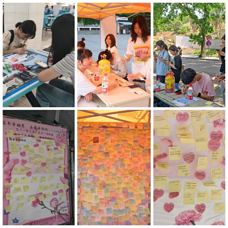 “家书寄相思,亲情牵两地”系列活动包括“一封家书”“两张照片”“三行祝福”三个主题子活动。“三行祝福”于5月8日母亲节分别在南岸校区、江北校区、兰花湖片区同时进行,鼓励同学们通过简短的话语,表达对母亲深厚的爱与感恩之情,吸引了近500名同学参与。